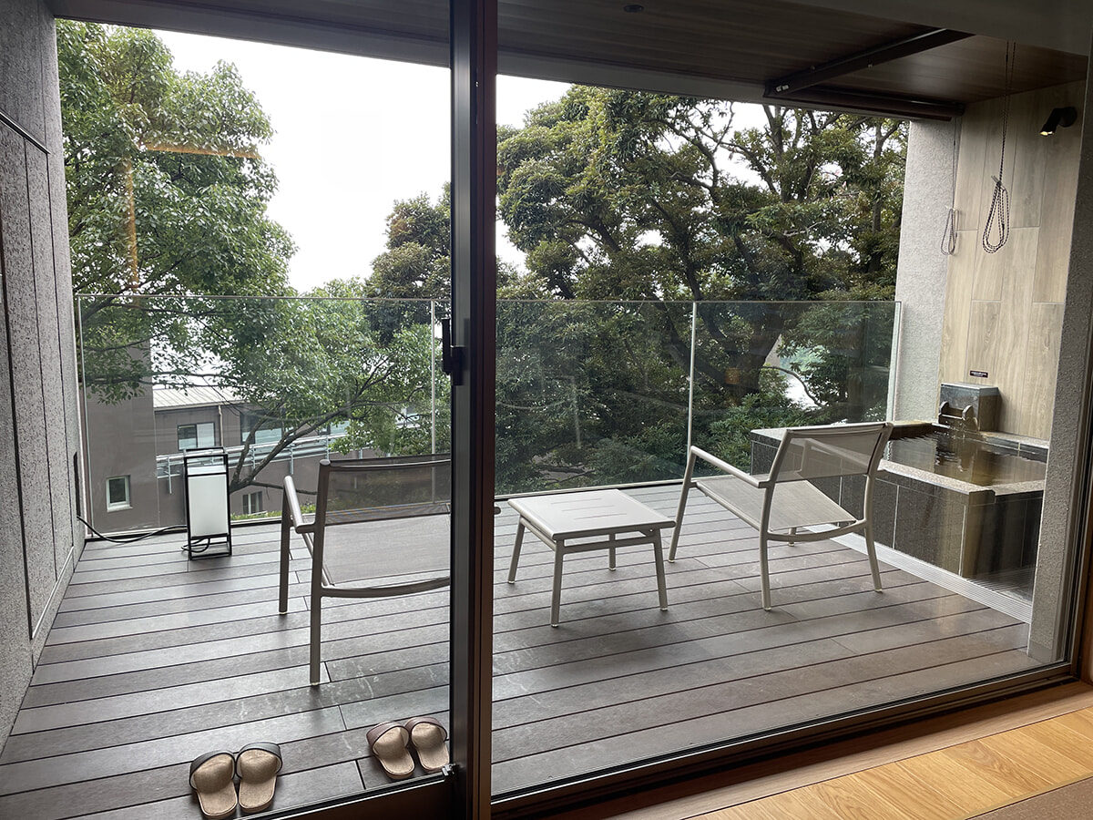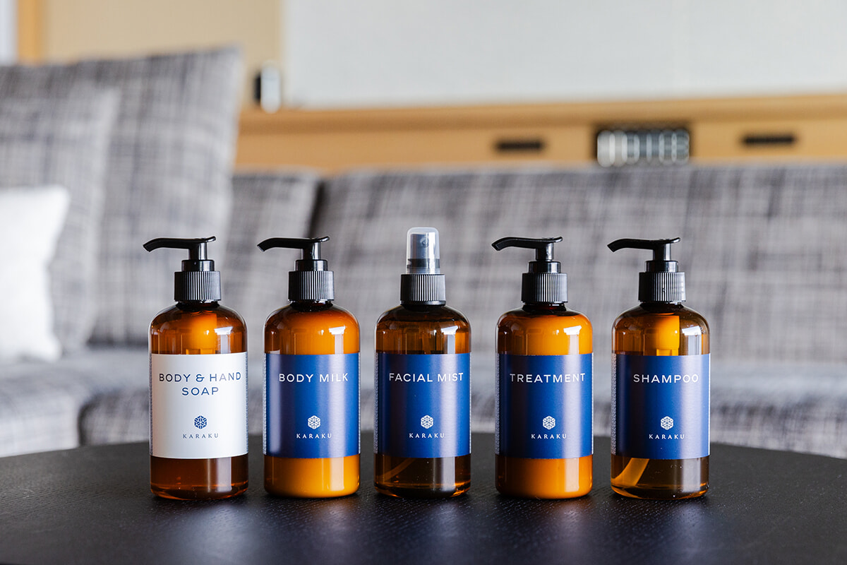 スパで全身をほぐされてから向かったのは、今回宿泊する「露天風呂付きデラックスルーム(和タイプ)」。露天風呂が付いているというだけで非日常感マシマシですが、佳ら久ではそれがデフォルト。テラスの一角に、当たり前のように設置されてます。お湯はもちろんこの地が誇る温泉で、絶えず注ぎ口から放出されているので24時間いつでもOK。というわけで、インフィニティ露天大浴場(写真最下段)と交互に朝晩2回ずつ堪能しました。個人的についチェックしてしまうアメニティはKARAKUオリジナルで、これがめちゃくちゃいい香り。ローズゼラニウムやシダーウッド、オレンジなどのエッセンシャルオイルを独自にブレンドしたもので、購入も可能だそう。