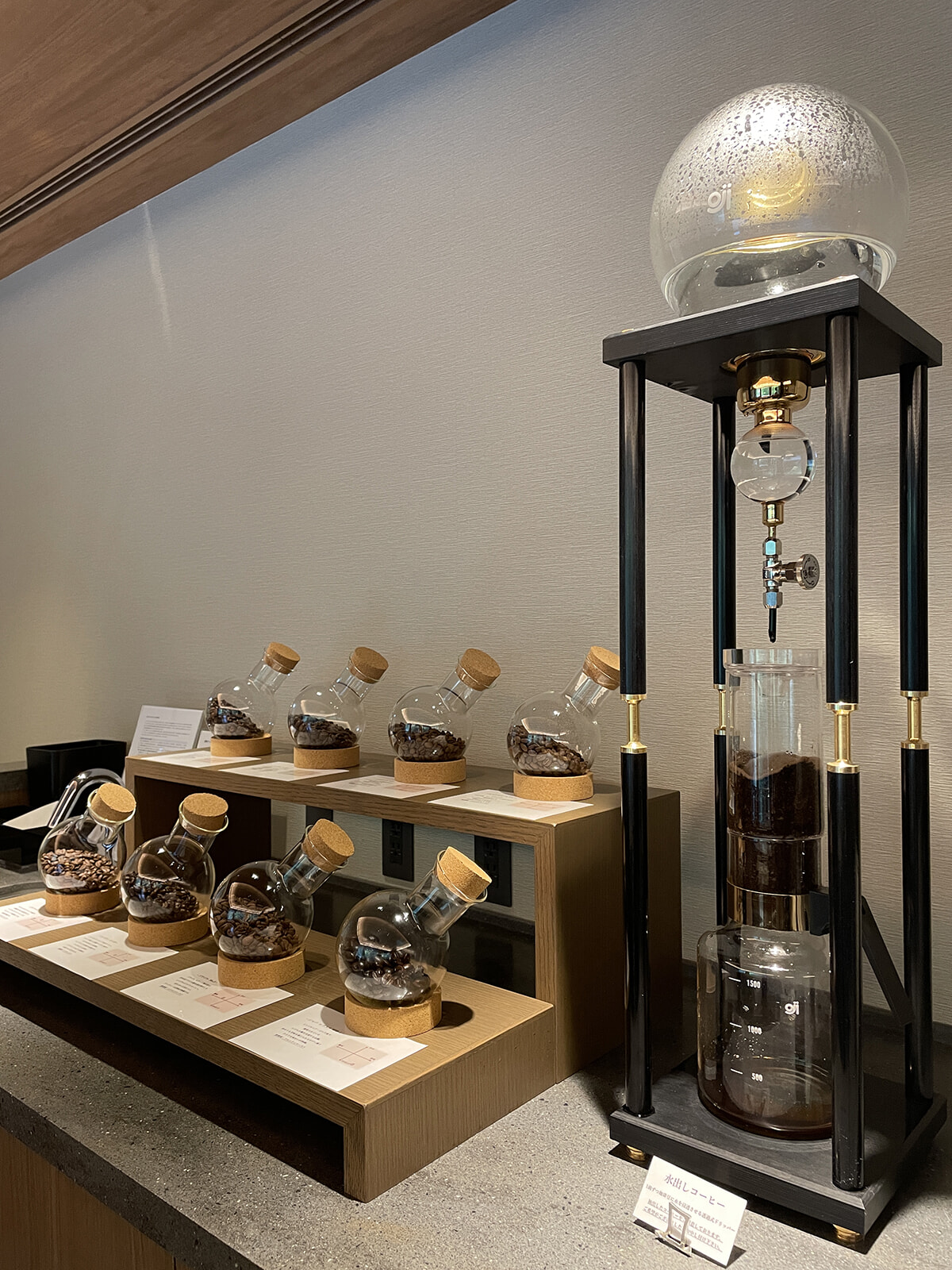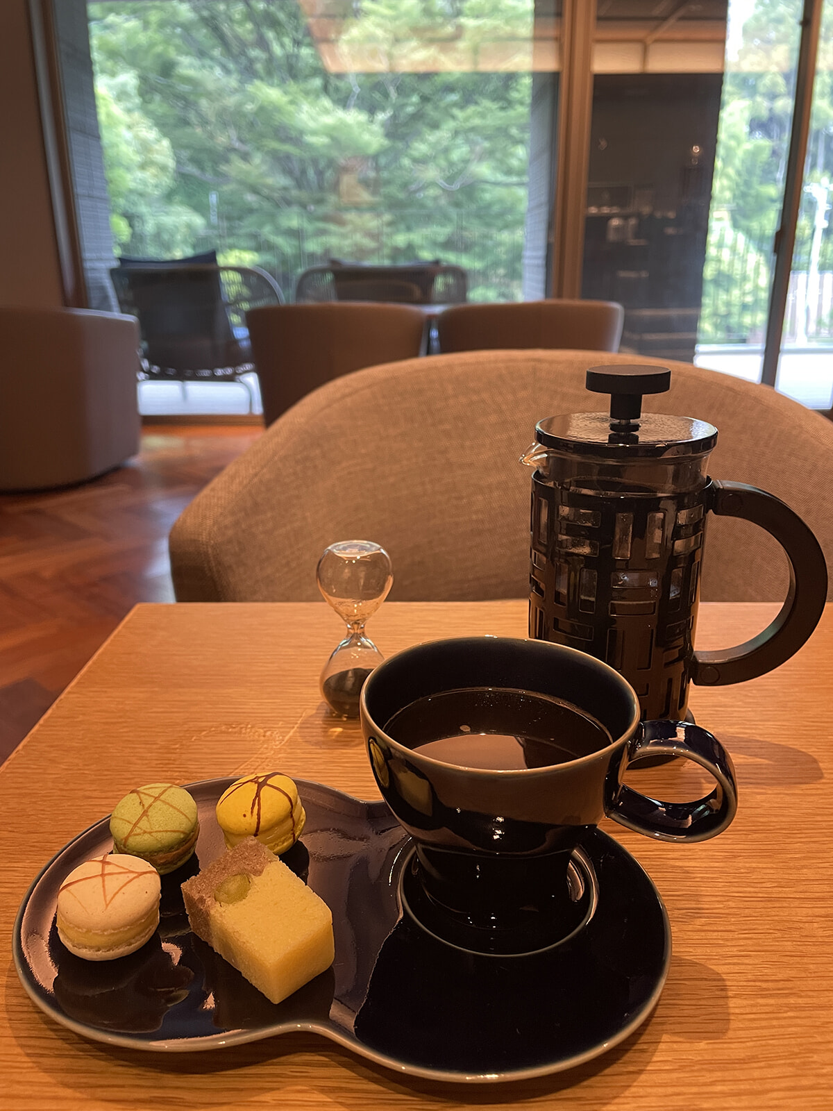 夕食まで少し時間があるので、館内に2ヶ所あるラウンジのひとつ「刻(とき)」でひと息。こちらではフレンチプレスによるコーヒーとティーが味わえます。コーヒー豆は8種の選択肢があり、カップもディスプレーされたさまざまなデザインから好きなものを選べるという心躍るおもてなし。ずらりと並んだ一口サイズのスイーツも美味しく、しかもこれらすべてフリーフロー。夕食前というのをすっかり忘れて長居してしまいました。