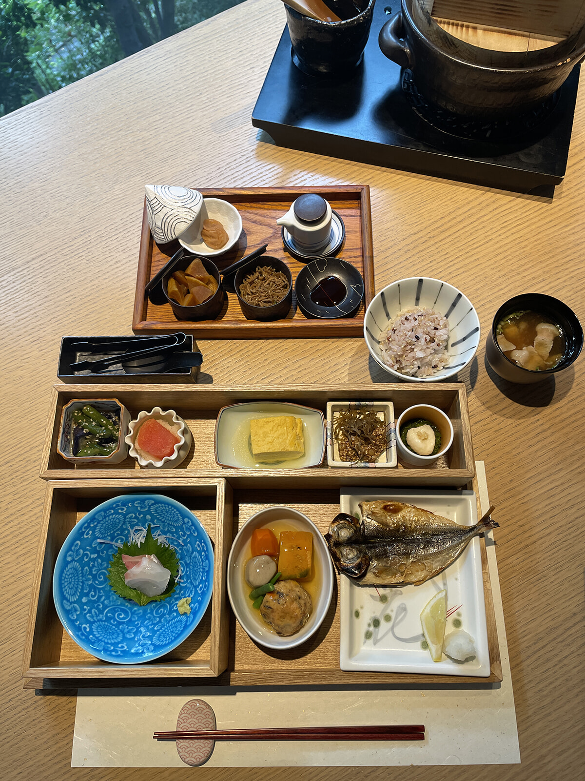お待ちかねの朝食は、ふたたびの「六つ喜」にて。下田の干物専門店、小木曽商店から取り寄せる鯵の干物やふわっふわの出来立てだし巻き卵など、1品1品が心尽しの味わいで箸を置く暇がありません。写真には写ってませんが、この後にパンナコッタと水菓子も供され、朝っぱらから完璧な布陣でした。