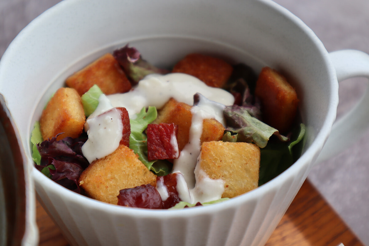 今回「ユニ」で提供されるランチ「heeee! ランチプレート」より、紀ノ国屋のかつサンドのパンの耳を使ったシーザーサラダ。 *画像はイメージ。実際の内容とは異なる場合があります。