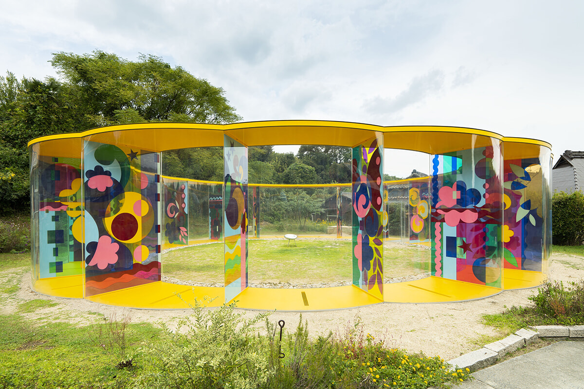 ブラジル出身の作家ベアトリス・ミリャーゼスによるA邸。円環状の空間を仕切るガラス板には生命のエネルギーに満ちた花や波が描かれている。 犬島「家プロジェクト」A邸 ベアトリス・ミリャーゼス『イエロー フラワー ドリーム』2018 photography: Yoshikazu Inoue