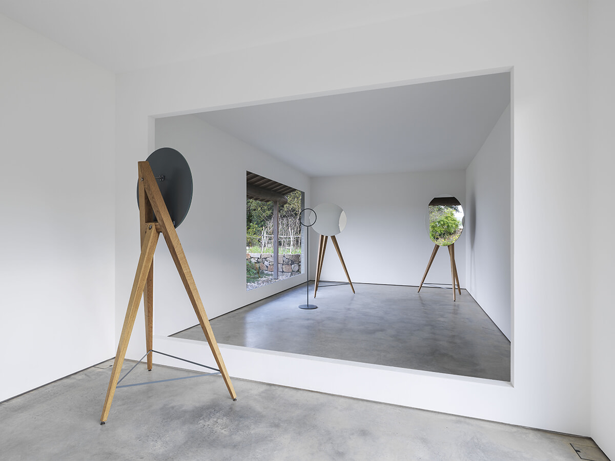 オラファー・エリアソンによるI邸。3つの鏡と2方向に開かれた窓の風景がある一点で結びつき、来場者は無限ループのトンネルの中間にいるような体験を得る。 犬島「家プロジェクト」I邸 オラファー・エリアソン『Self-loop』2015 photography: Yasushi Ichikawa