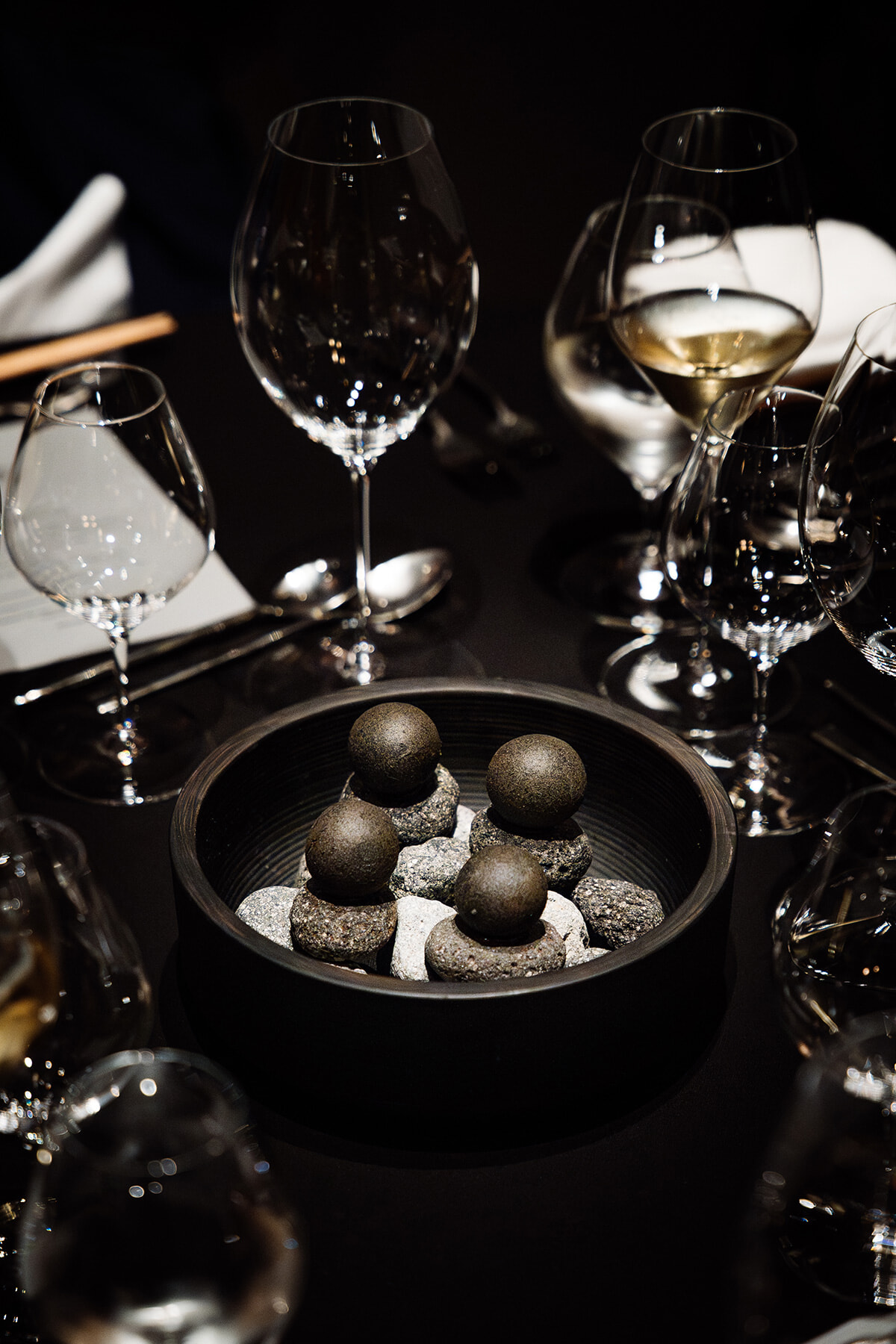 漆黒の球体が美しい「ブーダンドッグ」。さっくりと軽やかな衣を纏った、ブーダンノワールをアレンジしたアミューズブーシュ。