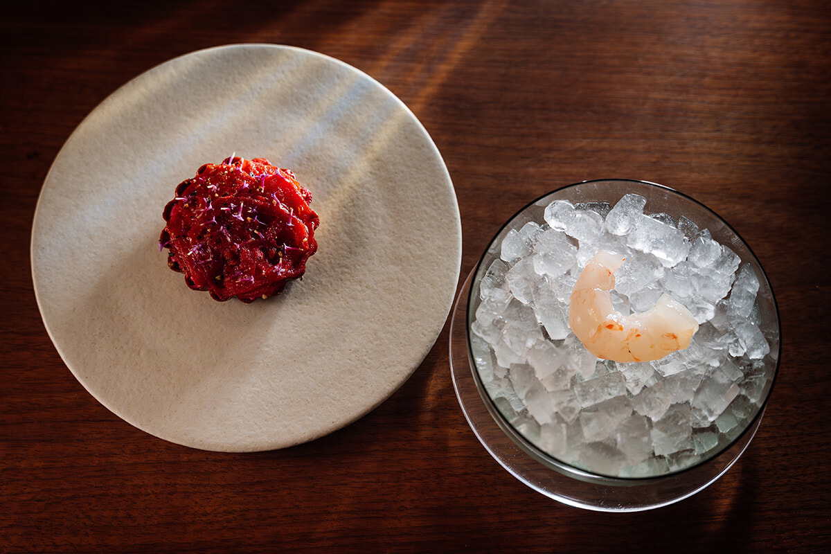 その後、高田シェフによる「トマト&ビーツ タルト」「ボタンエビのマリネ」の2品がテーブルに。むっちり甘やかなボタンエビはかんずりでマリネ。コクのある辛味を口に残したまま、鮮やかなタルトをひと口。スライスしたトマトの下には豆腐と味噌を使ったクリームチーズが潜み、ふんわりとした食感とまろやかさが口中で心地よいクッションのように感じられる。
