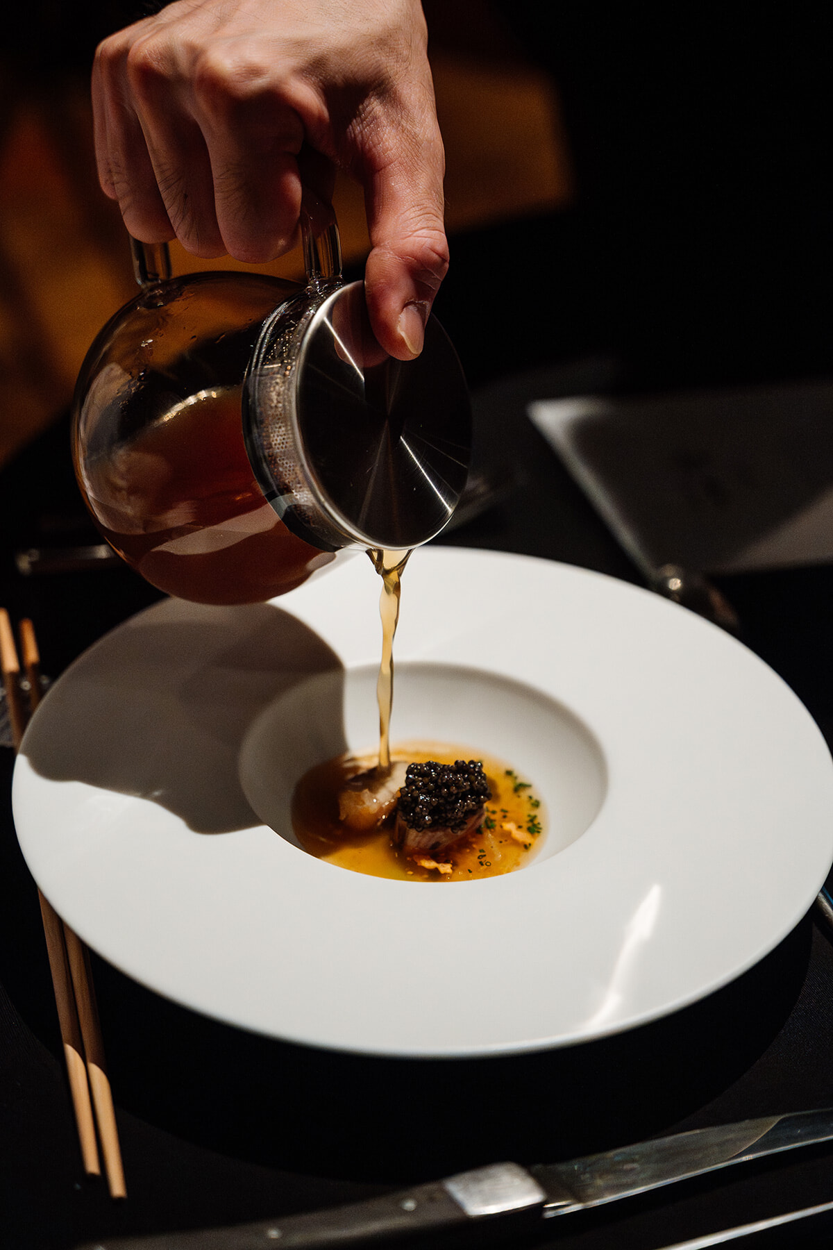 続いての料理は、ポーランドの発酵文化をまさしく体現したもの。ライ麦の発酵液を使った国民食、ジュレックスープを華麗にツイスト。燻製ウナギにポーランド産キャビアをのせ、そこにアラ出汁をベースにしたジュレックスープを。初めて食べる料理にもかかわらずどこかホッとするのは、日本も発酵大国だからからかもしれない。漬物に通ずる心地のいい酸味が印象的だ。