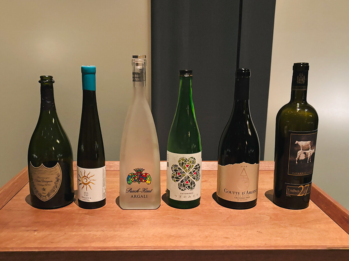 ワインペアリングもユニーク。「ドン ペリニヨン ソサエティ」の一員である高田シェフ。乾杯は「ドン ペリニヨン ヴィンテージ 2015」(左)。フォアグラの前菜に合わせたのは、ノリータで提供されているゲヴュルツトラミネール(左から2番目)。肉料理にはカベルネ・フランで造られたポーランドの赤ワイン(右)も提供された。