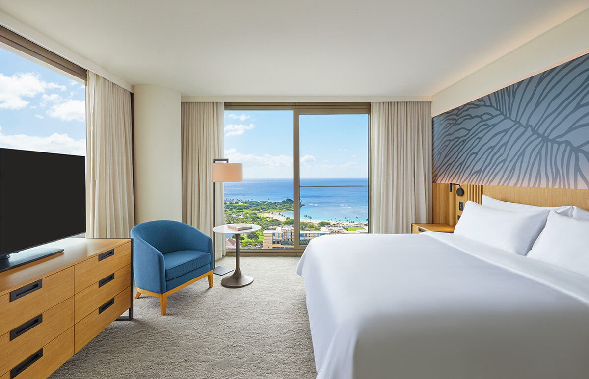 目の前にアラモアナショッピングセンター、その向こうにマジックアイランドまで見渡せるプレミアオーシャンビューに滞在できる!
