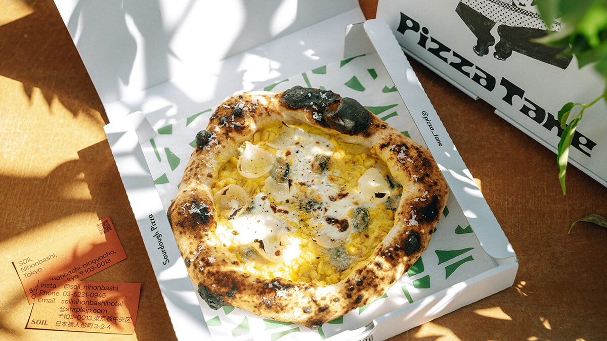 各部屋には、こちらも近隣や社内メンバーの実家などから集めたカセットテープとプレイヤーが完備され、アナログ音源の楽しさや手間のかかる愛おしさを滞在体験の一部として伝える仕掛けに。また、部屋のドアノブにはホテルの立ち上げメンバーが開業前に新潟県の糸魚川へ赴いて集めてきた石材が採用されていたり、館内の調度品にスタッフ総出で手ずからヤスリをかけた経緯があったりと、そこかしこに”手づくり”の温かみが感じられるのもこの宿泊施設の特徴のひとつ。1Fのフロントスペース横で営業する「Pizza Tane(ピッツァ タネ)」でも、そうした精神がインテリアや店内デザインに踏襲されている。