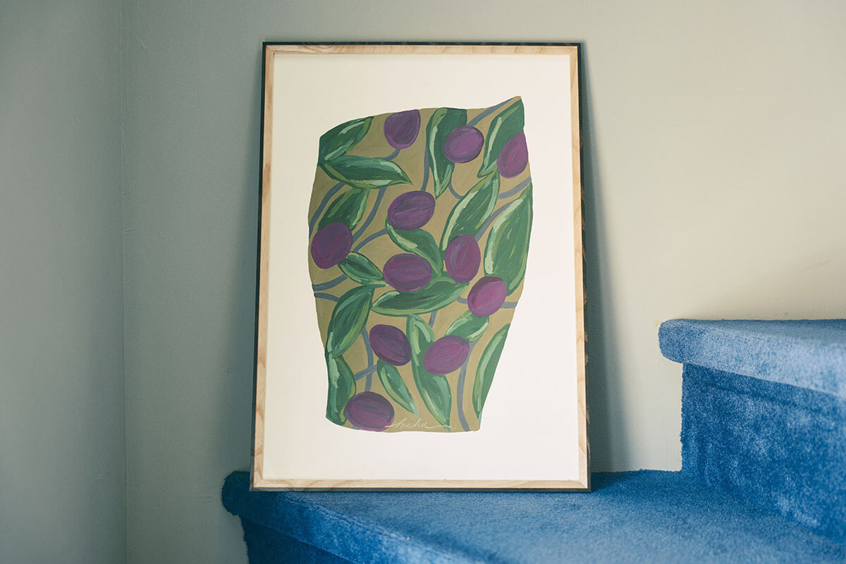 C&C開業の柿落とし展で在廊したヘルシンキ留学経験があるイラストレーターhuhu.の作品が螺旋階段に飾られている。