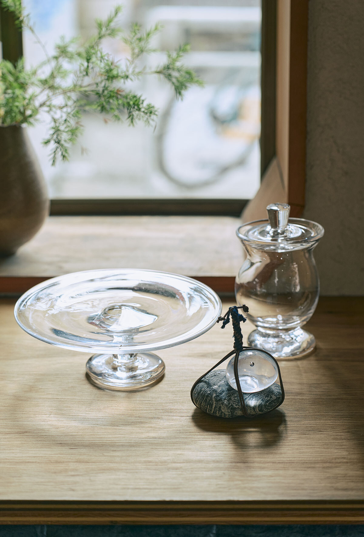 クリエイティブディレクターでありガラス作家でもある岡山出身の清野明香による有機的なガラス作品が置かれる。