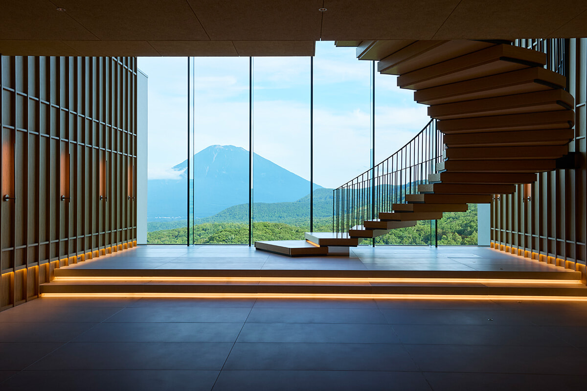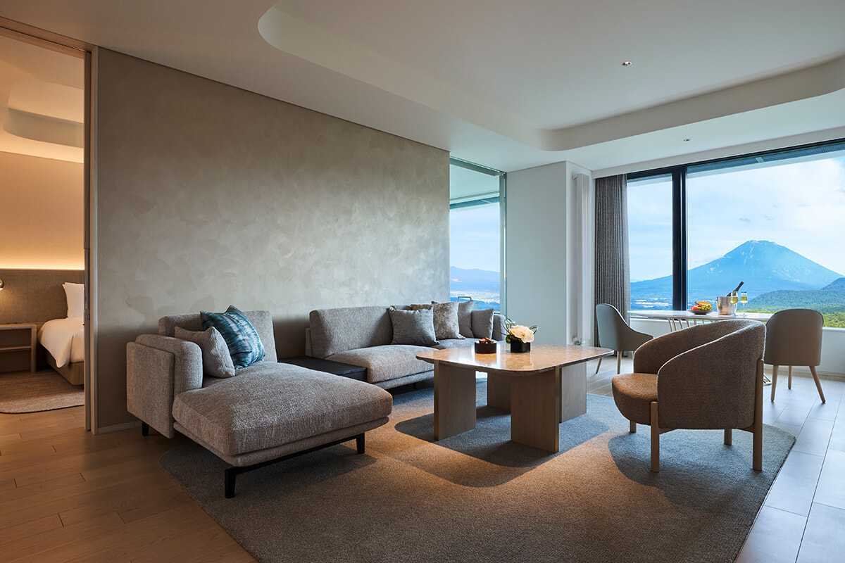 コーナー温泉スイートルーム「羊蹄」(88㎡)、羊蹄山サイドの客室で大きな窓からは山々以外にも花園、ヒラフエリアも全望。