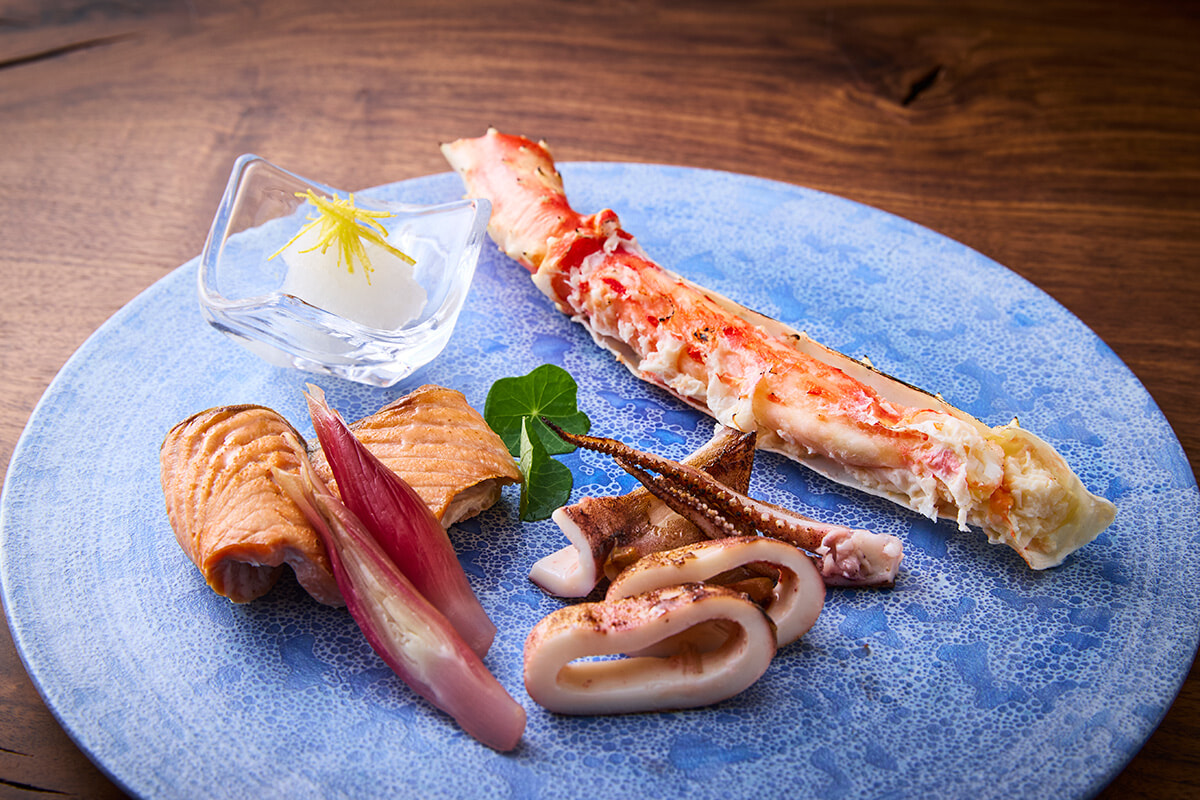 食事はメインダイニング「ザ クレスト」で。北海道の旬を飾る海の幸がぎっしりのディナーコースの逸品。特に冬は海の幸が豊富でおいしい。