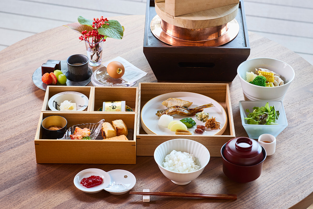 和と洋の朝食が揃う、写真はボリューム感のある和食。「季節の味わいと和食のインスピレーションが紡ぐ、洗練された現代的な食の体験」がコンセプト、地域の恵みが満載。