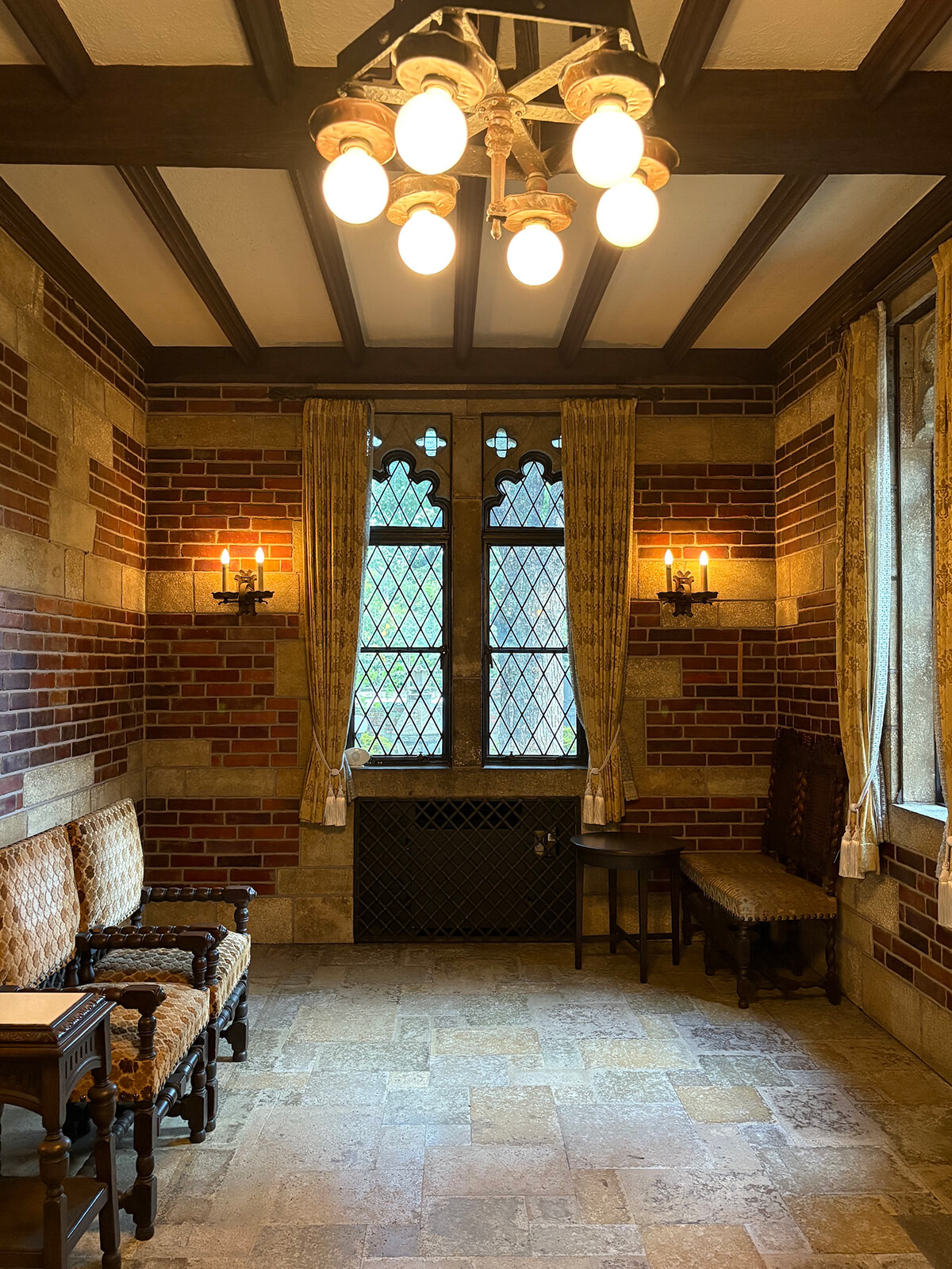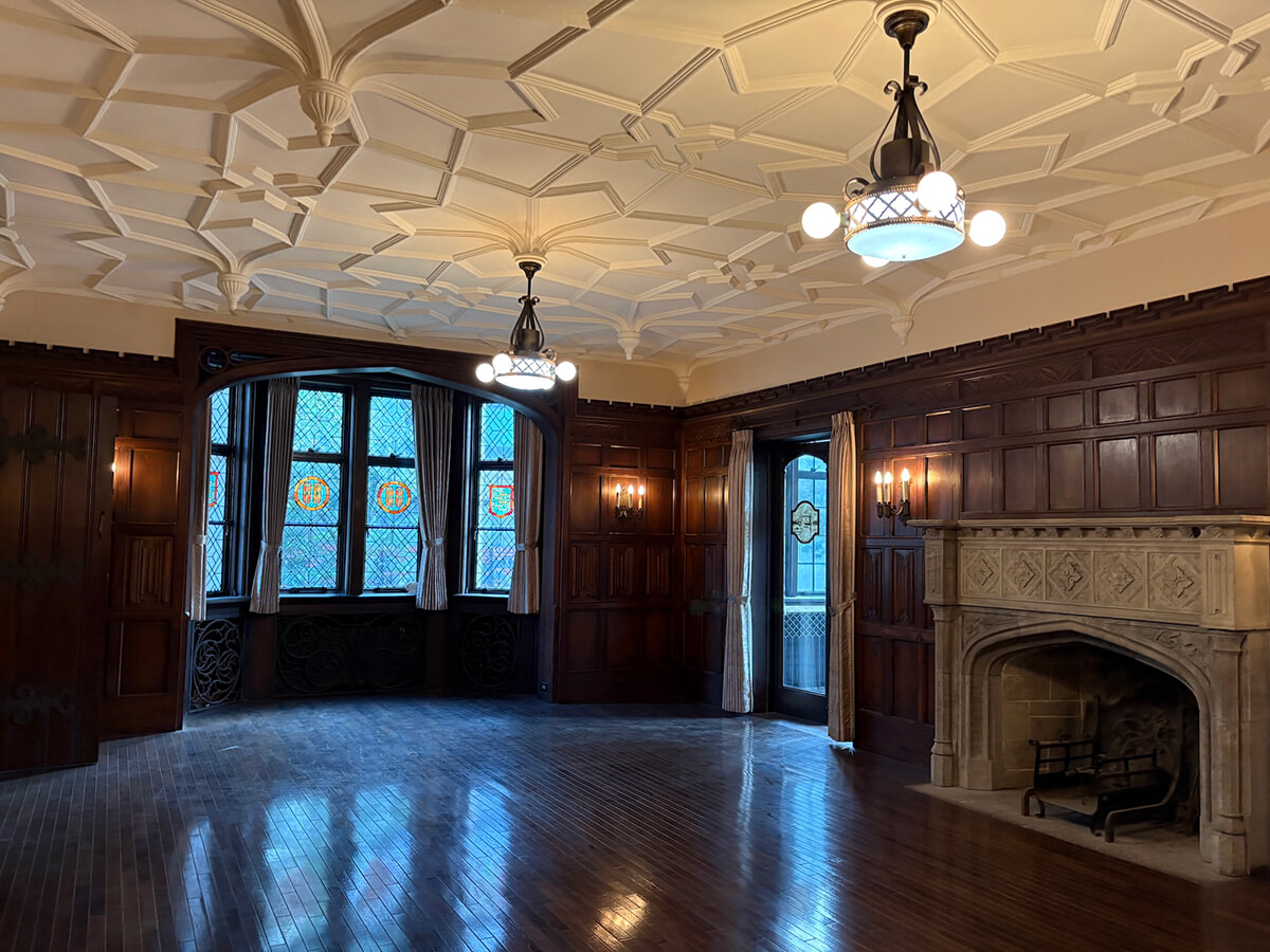 重厚感のあるマントルピースが設置されたリビングルーム。幾何学模様の天井や、布を折りたたんだような「リネンフォールド紋様」に注目を。ガラスには世界各地の旅の思い出を描いたエッチングや創業者のイニシャルも。