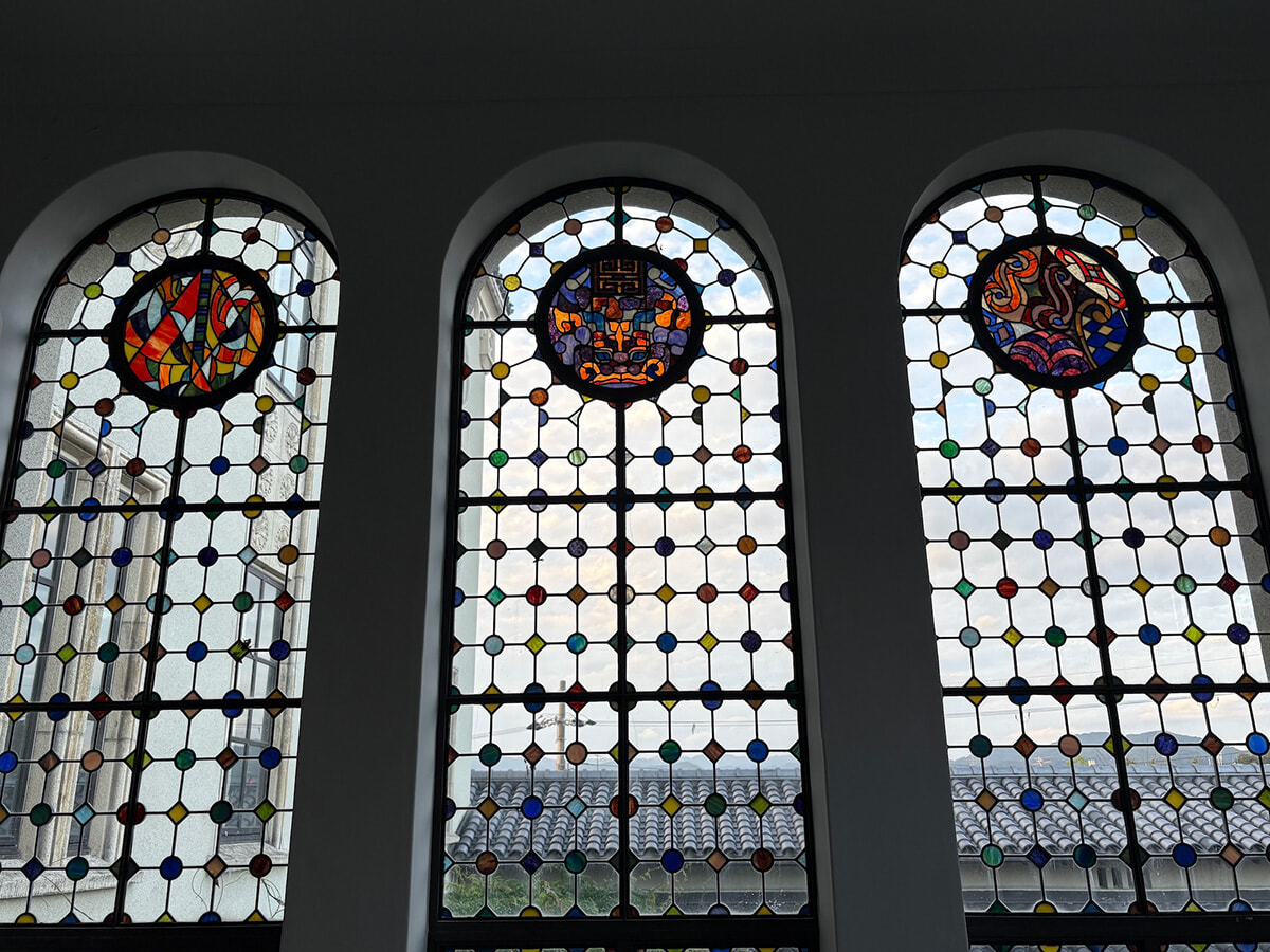 半円アーチの窓に軽やかに輝くステンドグラス。古墳時代に用いられた直弧文や、中国・唐時代に源流をもつ唐結文があしらわれています。