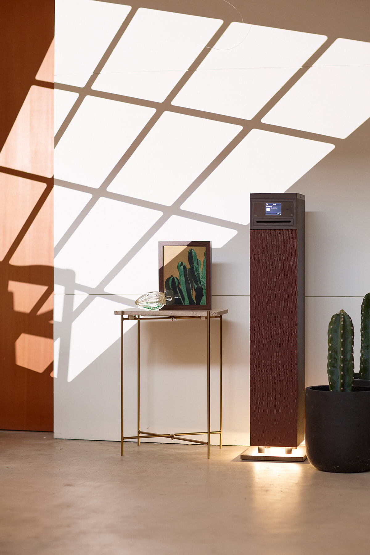 迫力あるサウンドと多機能性を兼ね備えたスピーカー。Bluetooth、CD、USB、ワイドFMなど多彩な音源に対応するだけでなく、ワイヤレス充電や間接照明機能も備え、日常のひとときを優雅に彩ってくれる。「カクタス」アクティブタワースピーカー(W23.5×D27×H98.5cm)¥88,000/シットバック&リラックス