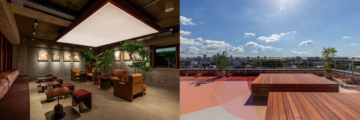 「THESTEPS」の2〜7階はリアルゲイトが運営するシェアオフィスになっており、12㎡〜91㎡台の全24区画からなる個室オフィスのほか、1名から利用可能なフリーデスクプランも。2〜4階には入居者専用の共有ラウンジを備えている(左写真は2階のラウンジスペース)。7階から階段を登ると幡ヶ谷の街並みが一望できるルーフトップテラス(右写真)もあり、このテラスを始めオフィス専有区画内ではペットフレンドリーというのも見逃せない。現在お問い合わせや内覧を受付中。