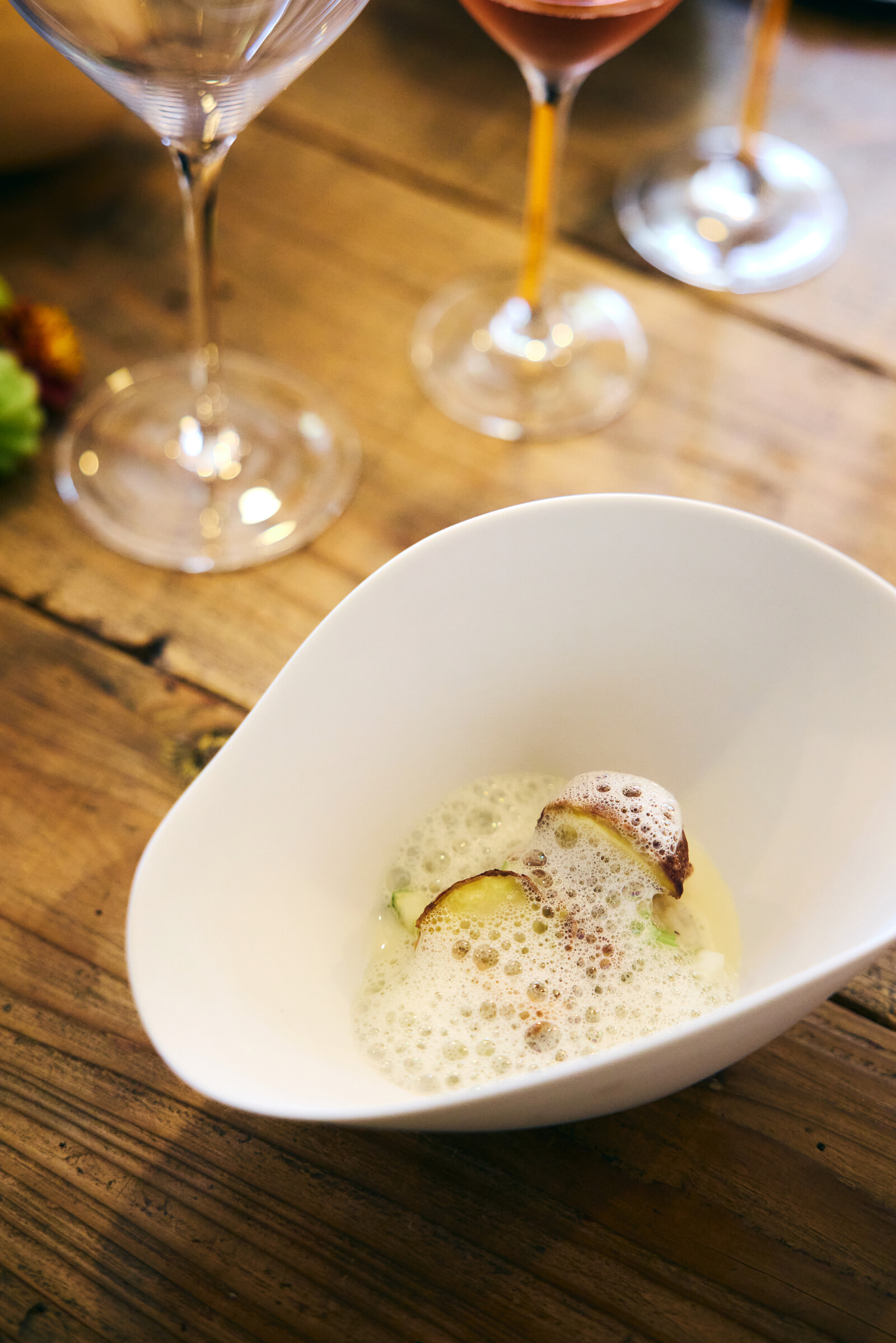 華やかながらもピノ・ノワールの力強さを感じるローズラベルに合わせるのは、旬のサトイモ、栗を揚げ焼きにしたものや、白インゲンと落花生をスープにし、ハーブを添えたメニュー。秋を感じる構成に、ゲストたちのスプーンも止まらない。