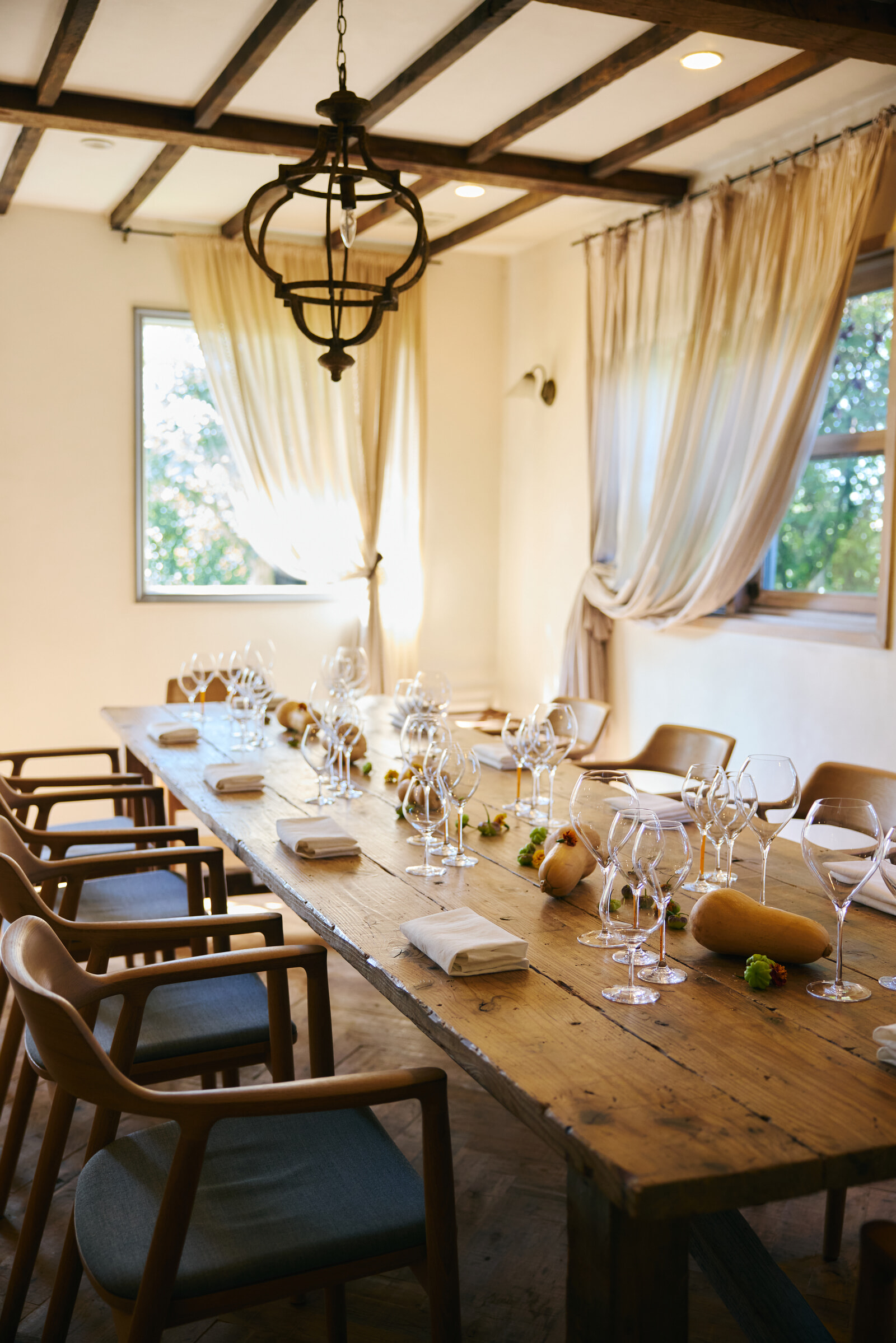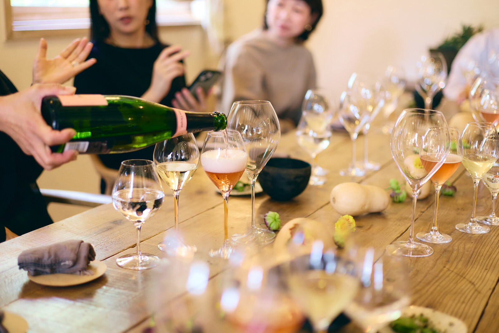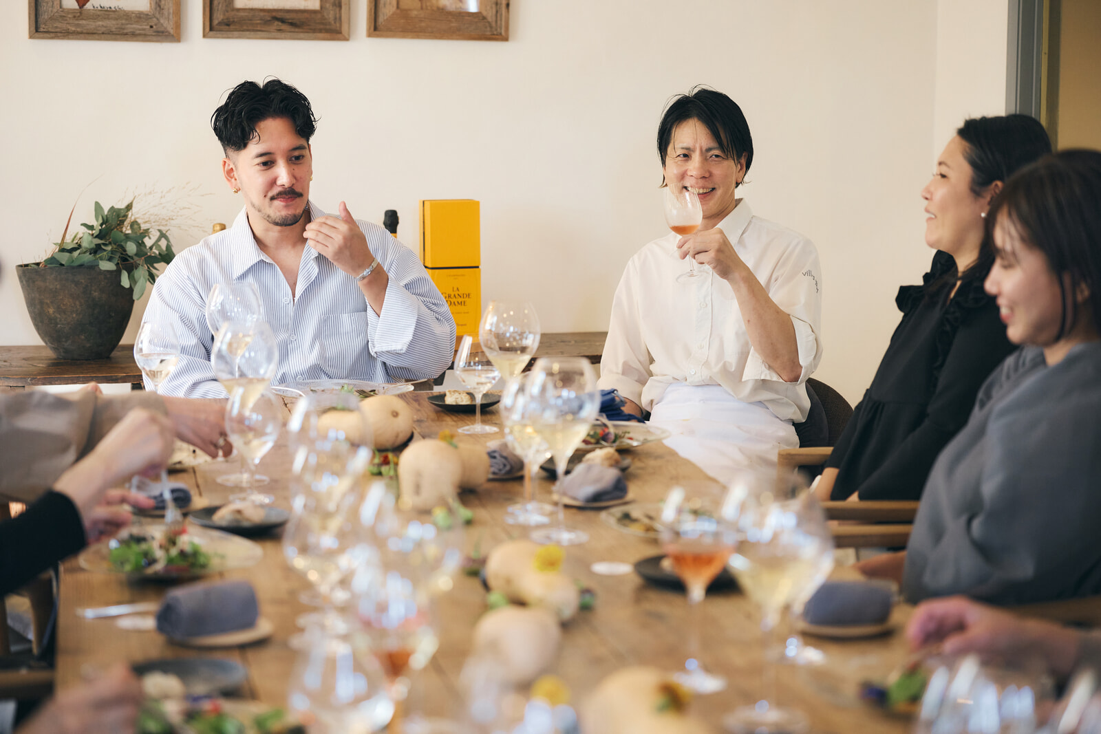 穏やかな午後の陽射しが降り注ぐ中、ロングテーブルにはシャンパーニュと食事の幸せな余韻がふわりと漂っているようだった。