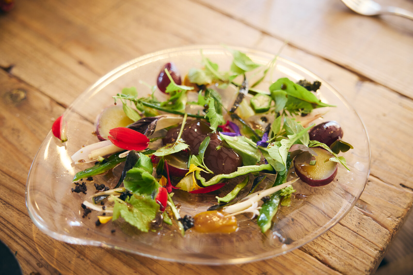 そして小林シェフから「メインです」と提供された料理に、ゲストはまた驚くことになった。テーブルの上に置かれたのは、さまざまな野菜や芋、フルーツやエディブルフラワーがちりばめられたサラダだ。