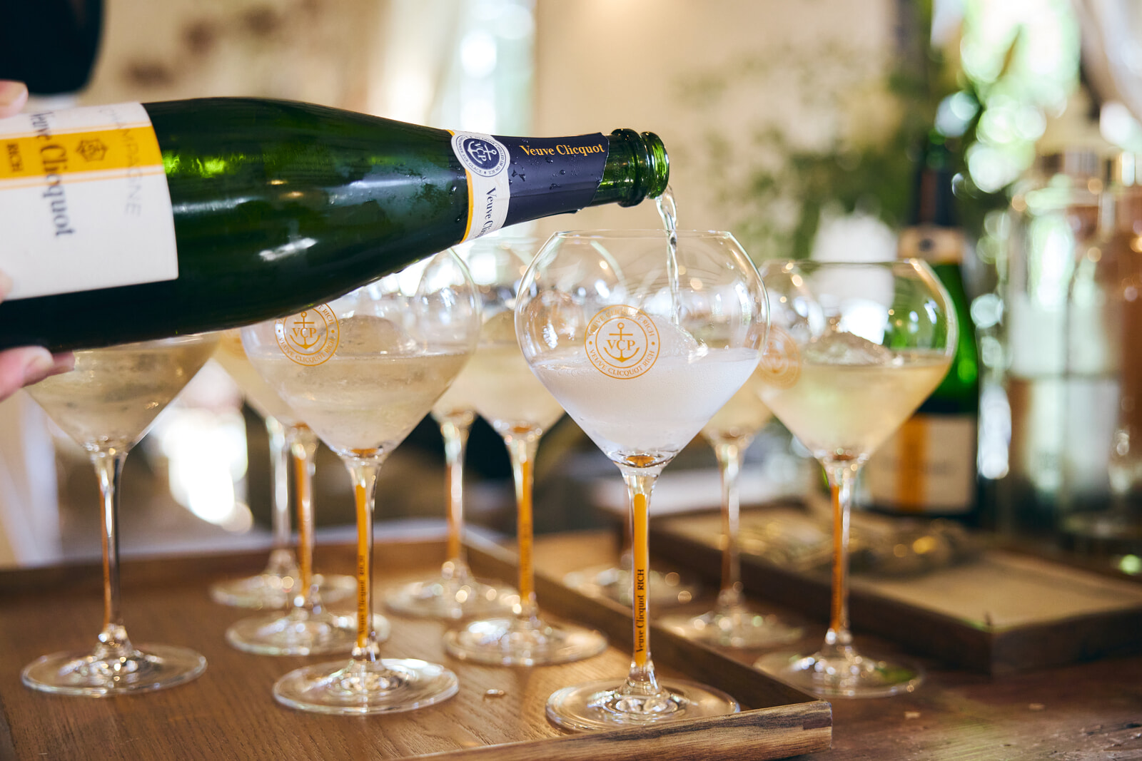 会場にゲストが揃い、 ウェルカムドリンクとしてマグナムボトルのヴーヴ・クリコ イエローラベル ブリュットが提供される。乾杯に先立ちヴーヴ・クリコのブランドディレクターから、メゾンとワインについて説明が行われる。