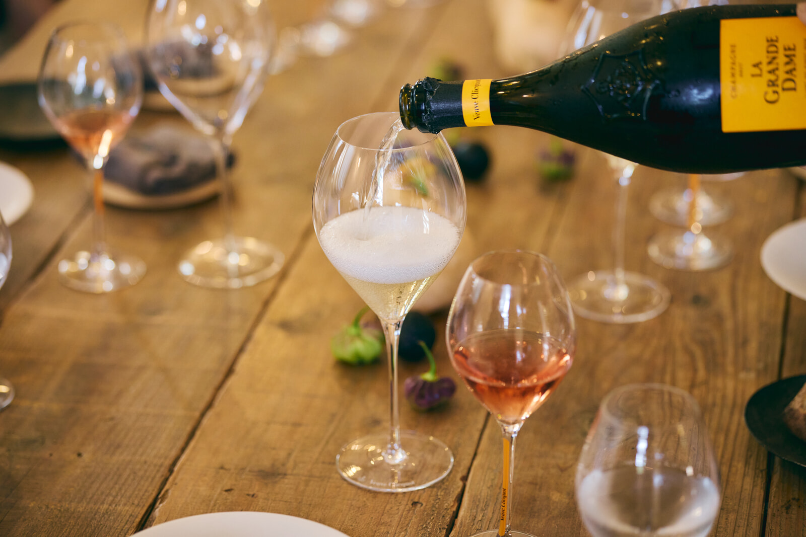 前菜を終えたゲストたちの前に、ヴーヴ・クリコ ローズラベルが注がれる。実はロゼワインの誕生にも、マダム・クリコは大きな役割を果たしている。