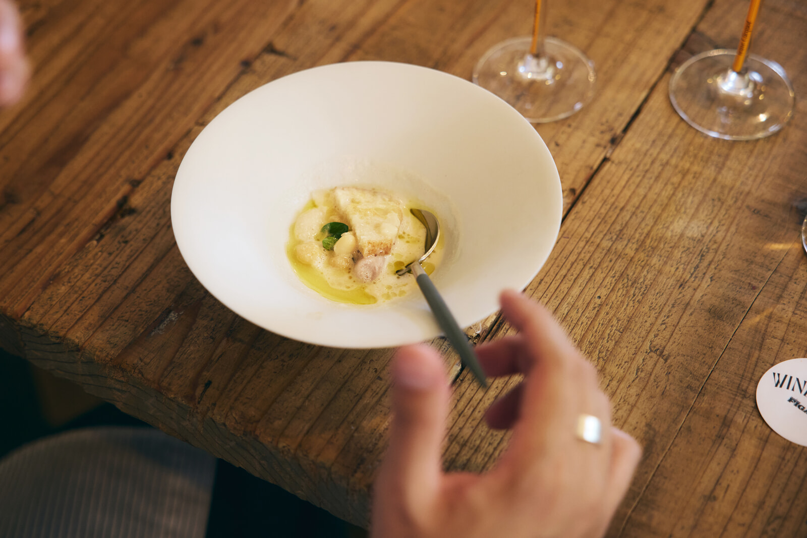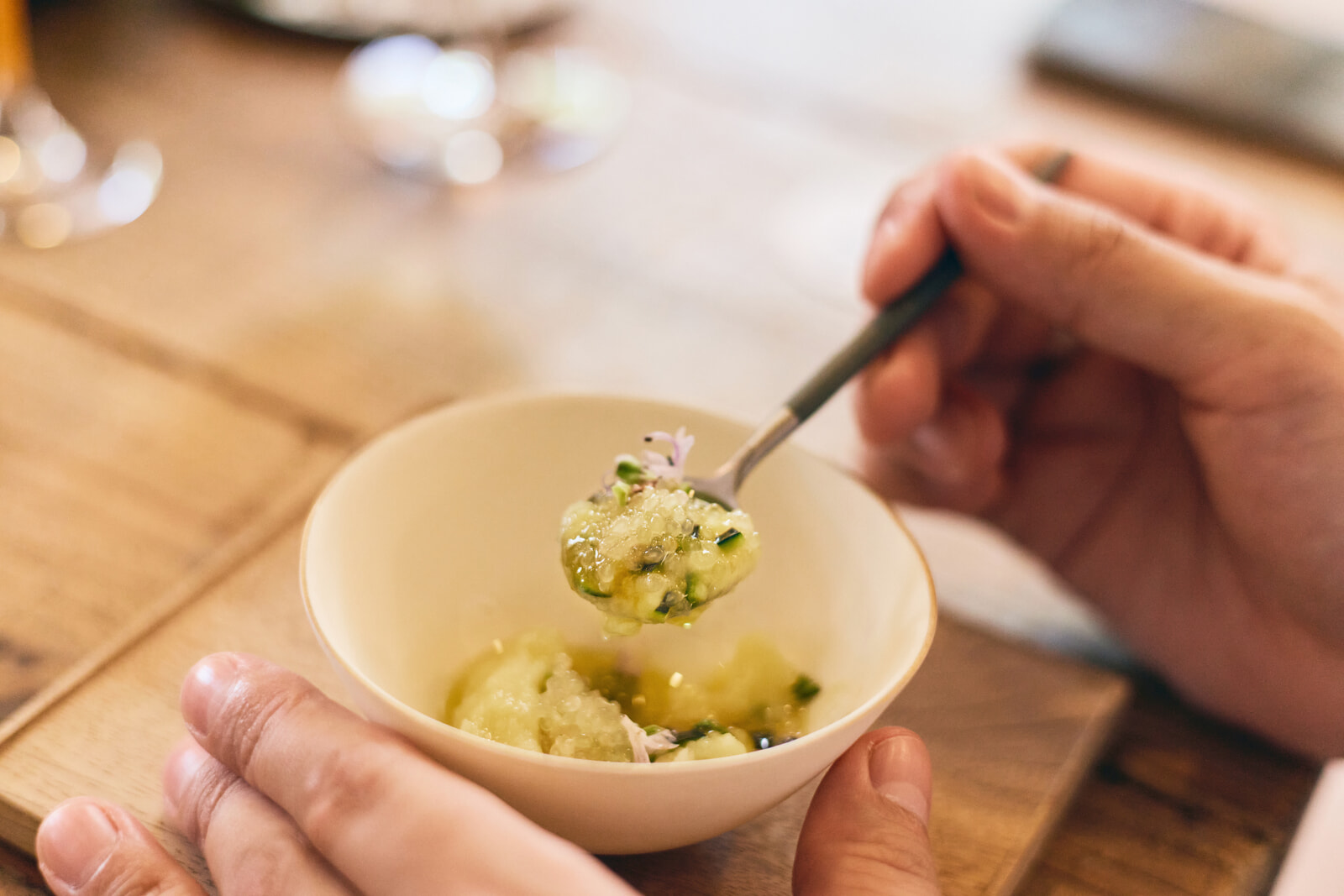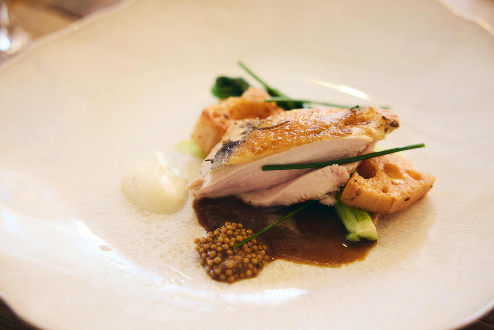 柔らかい葉物があれば、ねっとりとした芋、酸味のあるトマト、フレッシュなブドウ、香ばしいハーブ……。食べ進めるごとに味わいが変化していき、そのおいしさは豊かに広がる。ラ・グランダムを口に含むと、フレッシュさからしっかりとしたミネラル感、後味に残る長い余韻と酸味がまるで伴奏するかのよう。皿の上とグラスの中で、同じように複雑なハーモニーが表現されていた。