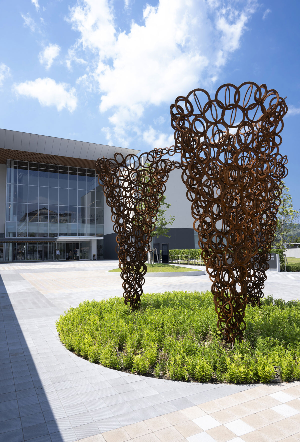 エントランスに立つ彫刻家・青木野枝による『しきだい』。そのほかふたりの作家による屋外彫刻を展示。町散策の合間に気軽に見られる開かれたアートとなっている。