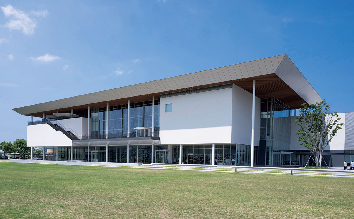 建築は島根県出身の高松伸が手がけた。弧を描くシルエットが特徴。