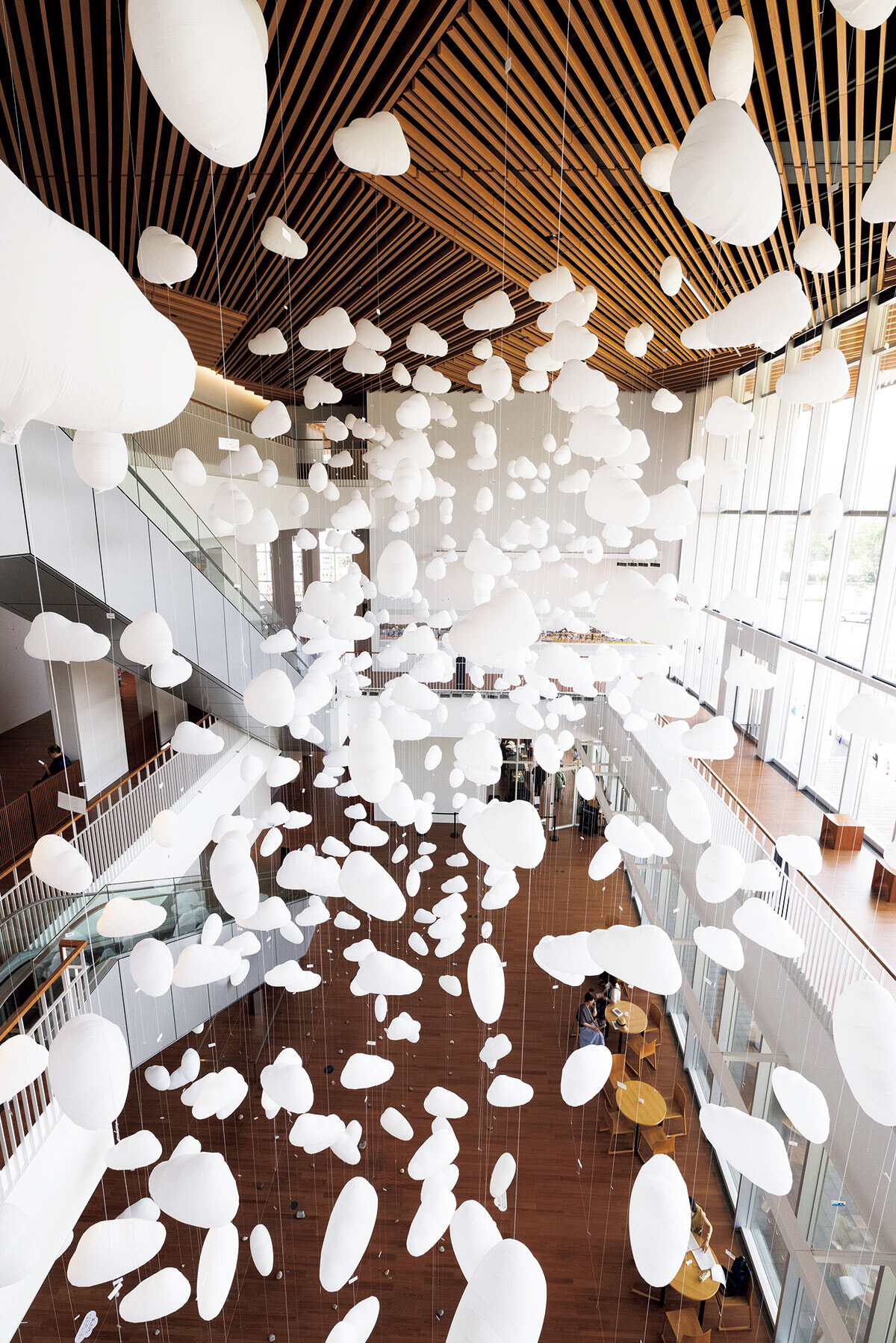取材時は髙橋匡太による光のインスタレーション『雲の故郷へ』が展開されていた。天井は鳥取砂丘の風紋や倉吉絣(かすり)の織り模様をイメージしている。