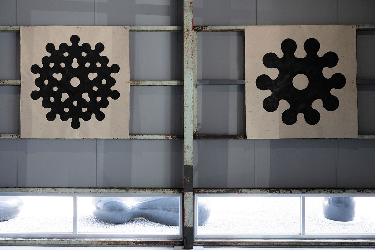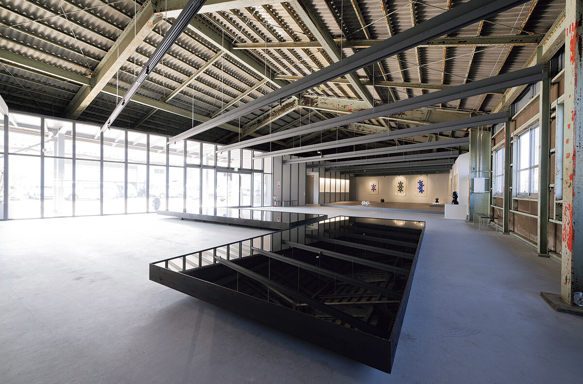 梁は新設したものの、柱や壁は元の倉庫の風情を生かした。原口典之の『Oil and Water』。手前の型は、水を張ることで錆びて朽ちていく様子を見せている。奥の展示スペースの作品は企画によって替わる。