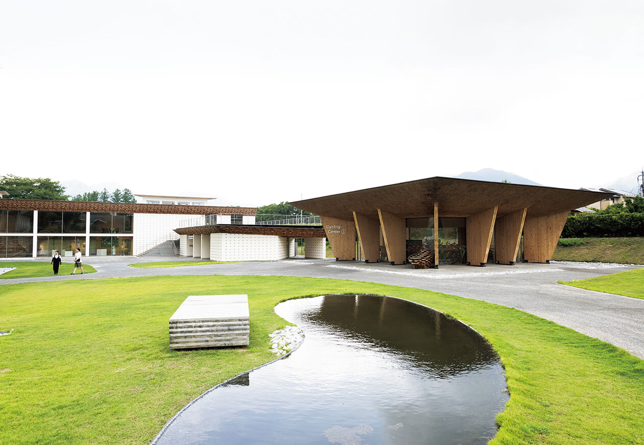 右奥に見えるのはサイクリングセンター。この地域で800年続く山焼き文化に隈が着想を得て、屋根に茅を使用。