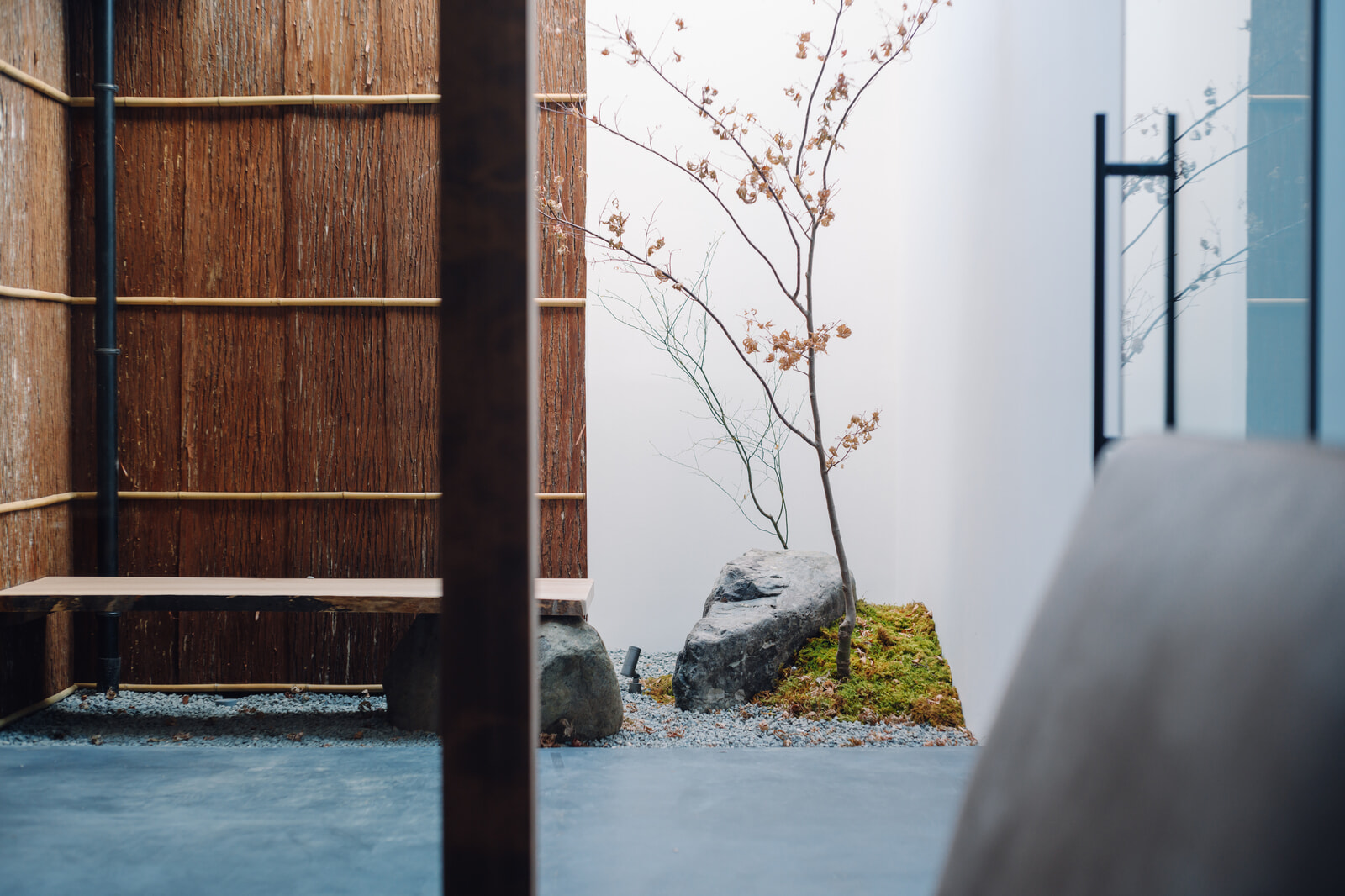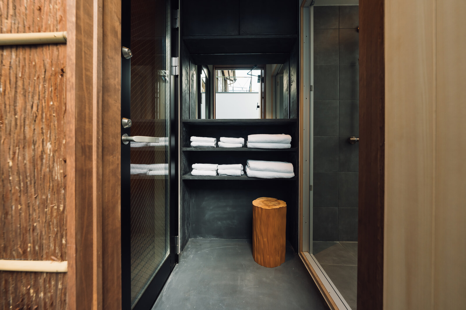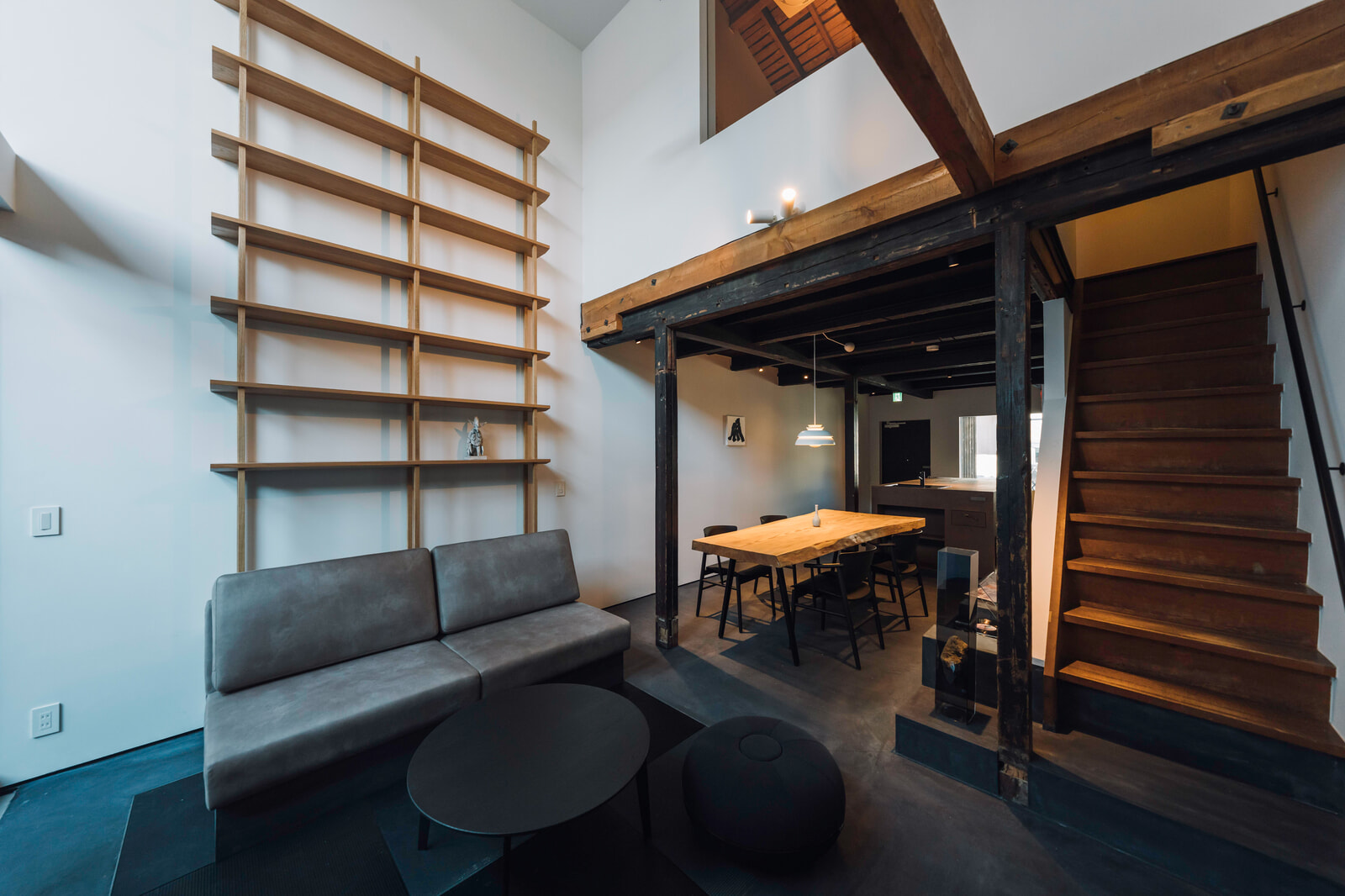 室内は京都で活動する作家たちとのコラボレーションによる、和の素材感を重視した空間作りに。床には炭を混ぜた左官仕上げを用い、大きなキッチンは和紙作家のハタノワタルによる和紙で包み込まれたデザインで、シックながら温かみのある空間に。中央のリビングには、YOKOYAMA TATAMIの黒畳が敷かれ、古民家=ノスタルジーという発想を裏切るような、静かでモダンな雰囲気が漂っていました。