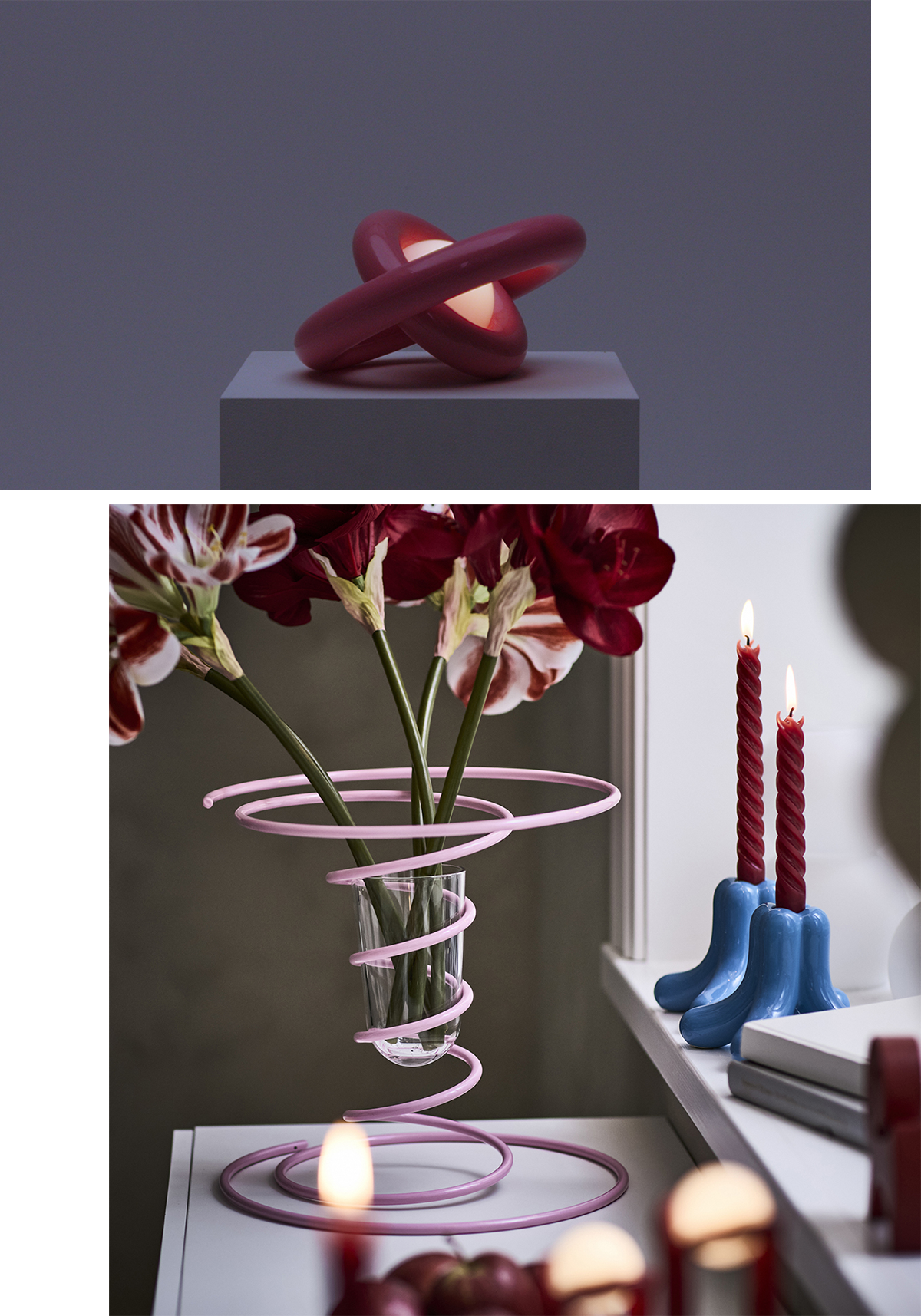 発端はお祝い事に特別な理由はいらない、日常の喜びを分かち合える事を作り出そうというアイデアだ。また、それに対するイケアとグスタフの想いは、伝統行事を祝う楽しみの詰まったモダンでインフォーマルな、でも歴史を重んじるモノ造りを探究する事だった。そこから出来上がったのが陶磁器のプレートからカップ&ソーサー、キャンドルホルダーやスタンド、そしてランプをモダンな遊び心のある、かつ伝統的視点からも捉えた品々だ。