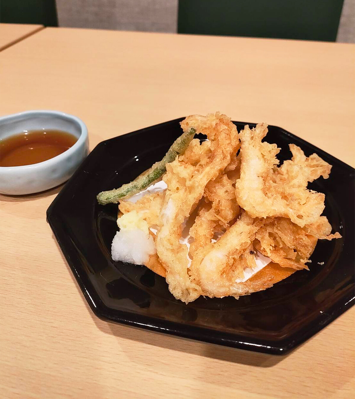 夕食はちょっと贅沢にアップグレードし、特別メニューの「白エビの天ぷら」と「能登牛の陶板焼き」をオーダーしました。富山湾で獲れた新鮮な白エビは、この地を訪れたら食べておきたいもののひとつ。サクッと揚がって甘みたっぷり。