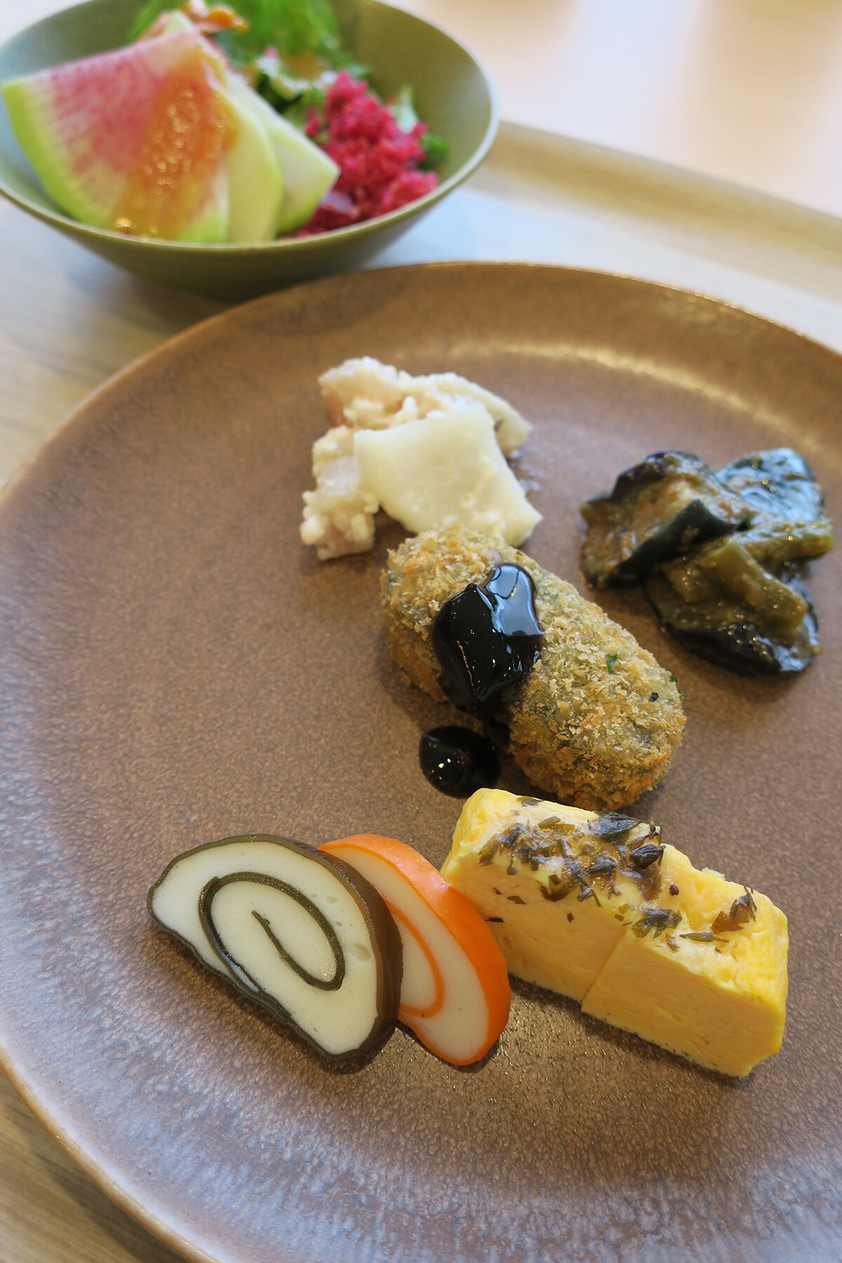 翌日の朝食ビュッフェでは、富山の地元の味を厳選してみました。写真手前から、昆布で巻いたかまぼこ、富山湾でとれる海藻「ながらも」あんかけ卵焼き、イカスミコロッケ、左奥が郷土料理の「鰤と大根の麴和え」、右奥が「ナスのよごし」。彩り鮮やかな野菜類も添えて。ほかにもブラックラーメンなんかもあって、胃に余裕があったらあれもこれも挑戦したい!と思うほど。