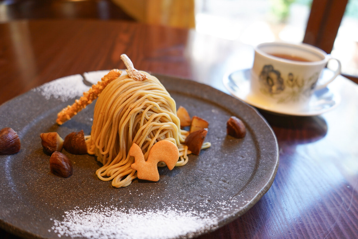 モンブランのプレートには、かわいらしい小鳥やリスのクッキーが添えられている。店内から眺められる中庭には、実際に小鳥やリスが立ち寄ることもあるとか。絵本の世界のような、ちょっと特別なティータイムを楽しんで。