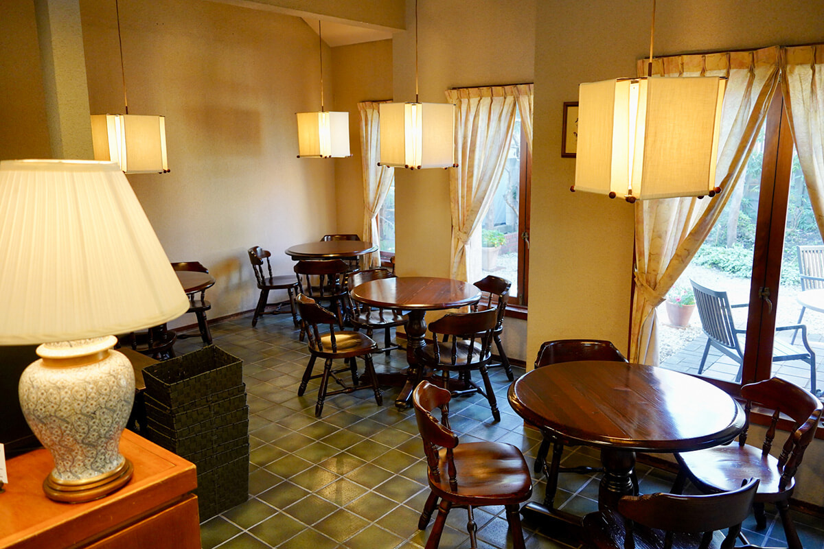 中庭をのぞむ、アンティーク調の落ち着きある店内。