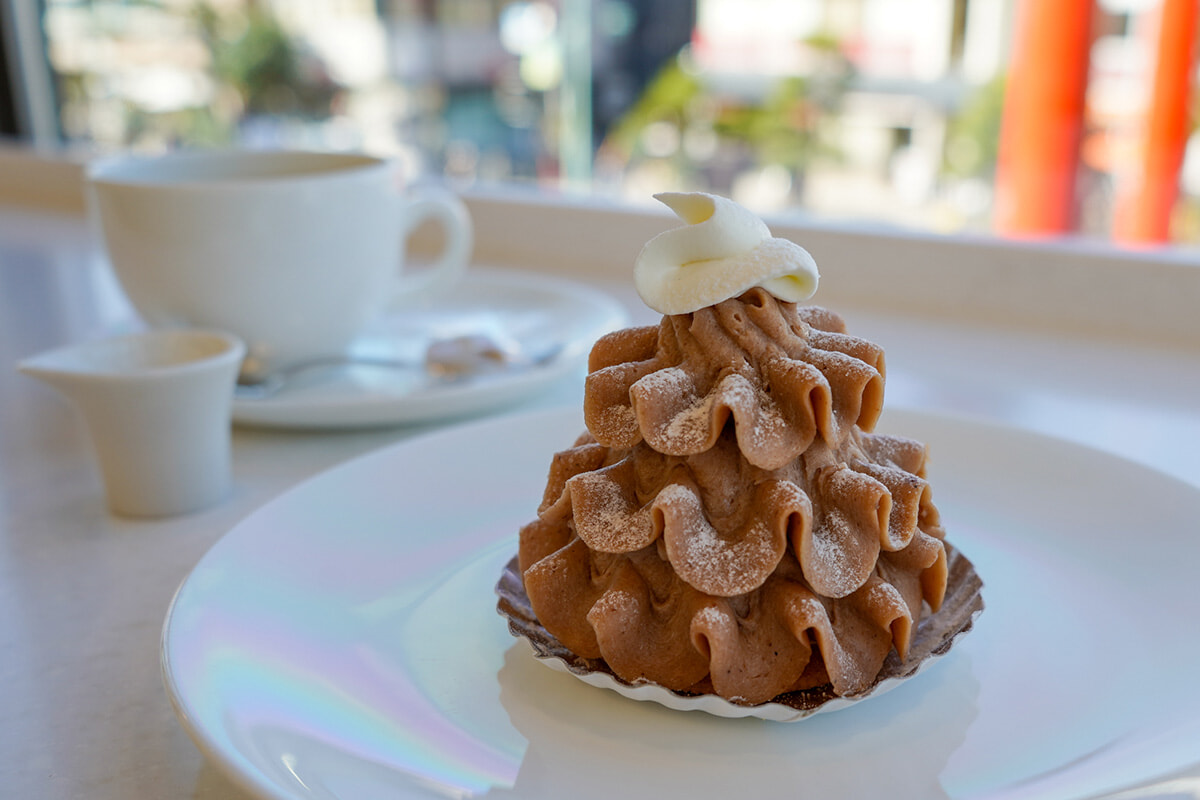 この店に行ったらぜひ味わってほしいのが、イートイン限定のモンブラン。注文を受けてから仕上げるため、ふんわりとした食感がたまらない。