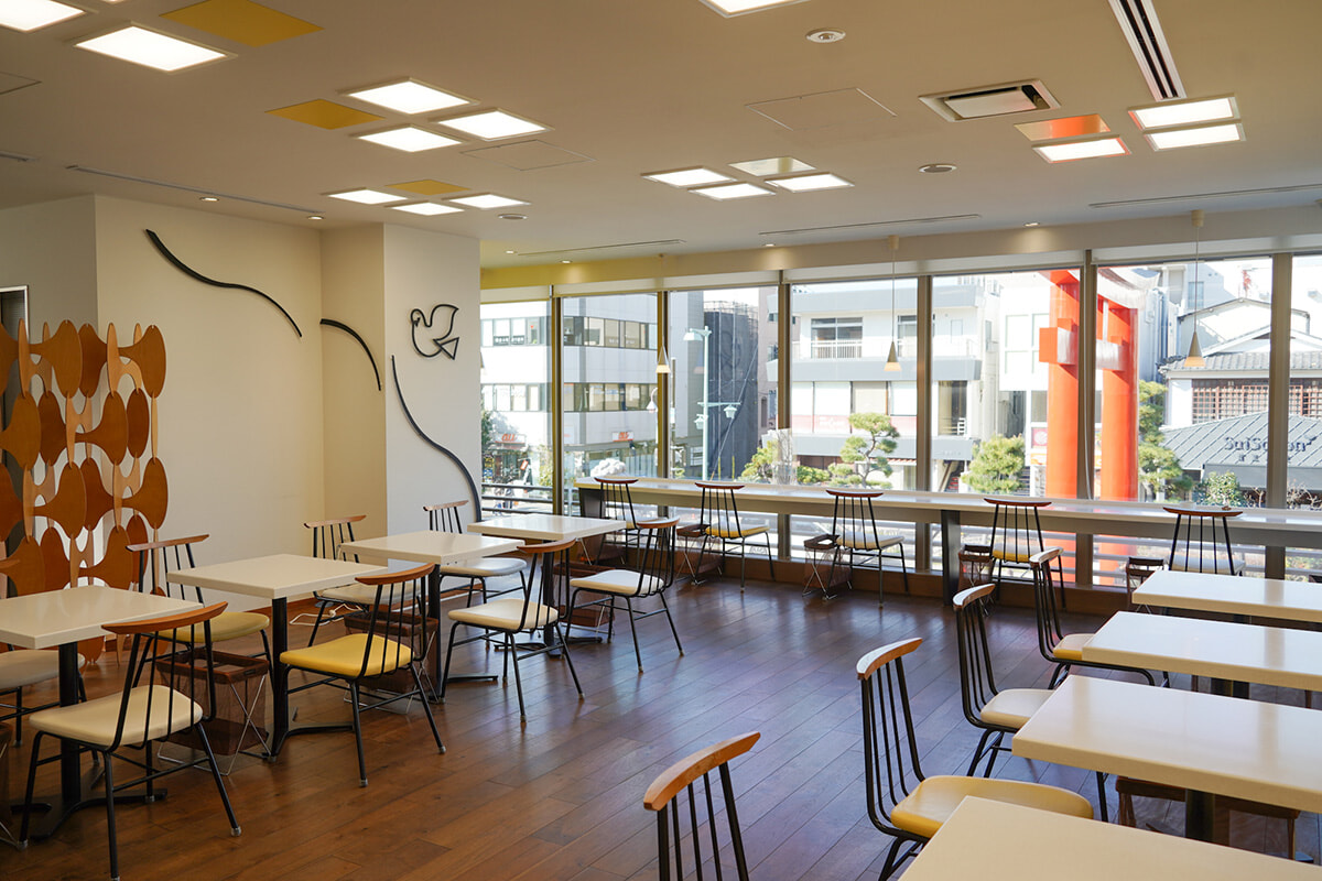 1階は色鮮やかなケーキや洋菓子などが並ぶショップで、2階がカフェ、3階が厨房となっている。カフェの店内から鶴岡八幡宮の鳥居と、参道である段葛(だんかずら)が見下ろせる、ロケーションの良さも人気だ。