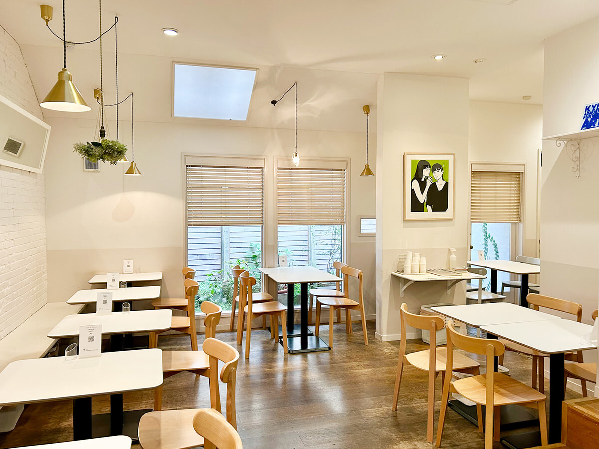 白を基調とした優しい雰囲気のインテリア。奥行きがある店内は42席あるのでゆっくりとくつろげる。