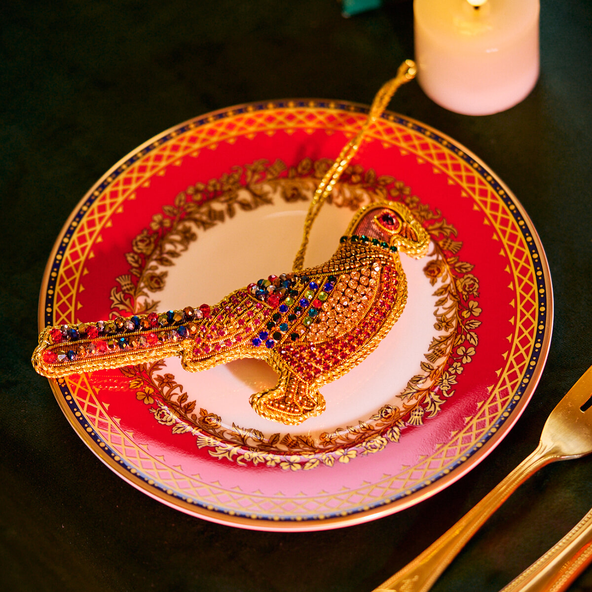 宮殿内のイエロードローイングルームとセンタールームの壁紙に描かれたキジをモチーフに作られたクリスマスデコレーション。ツリーにはもちろん、テーブルセッティングに活用しても。