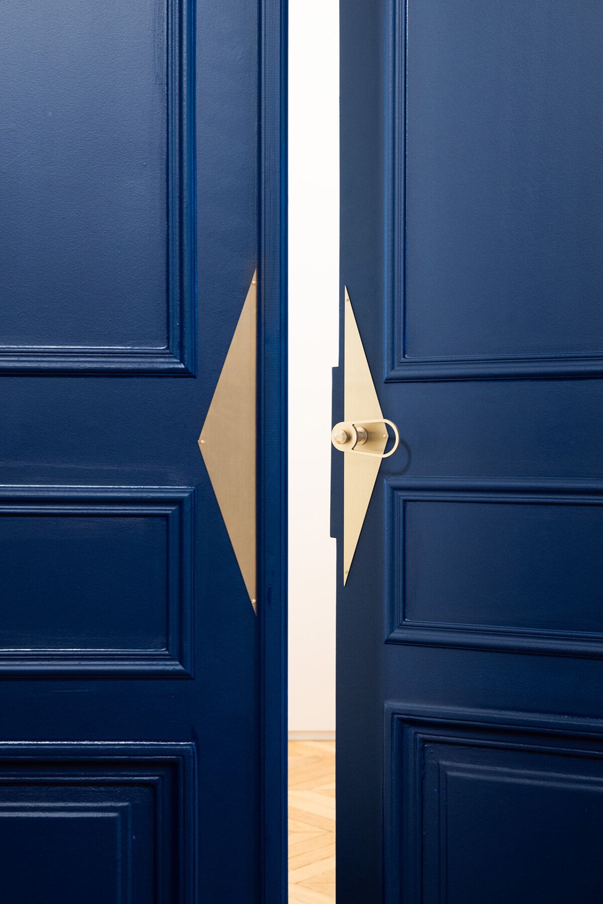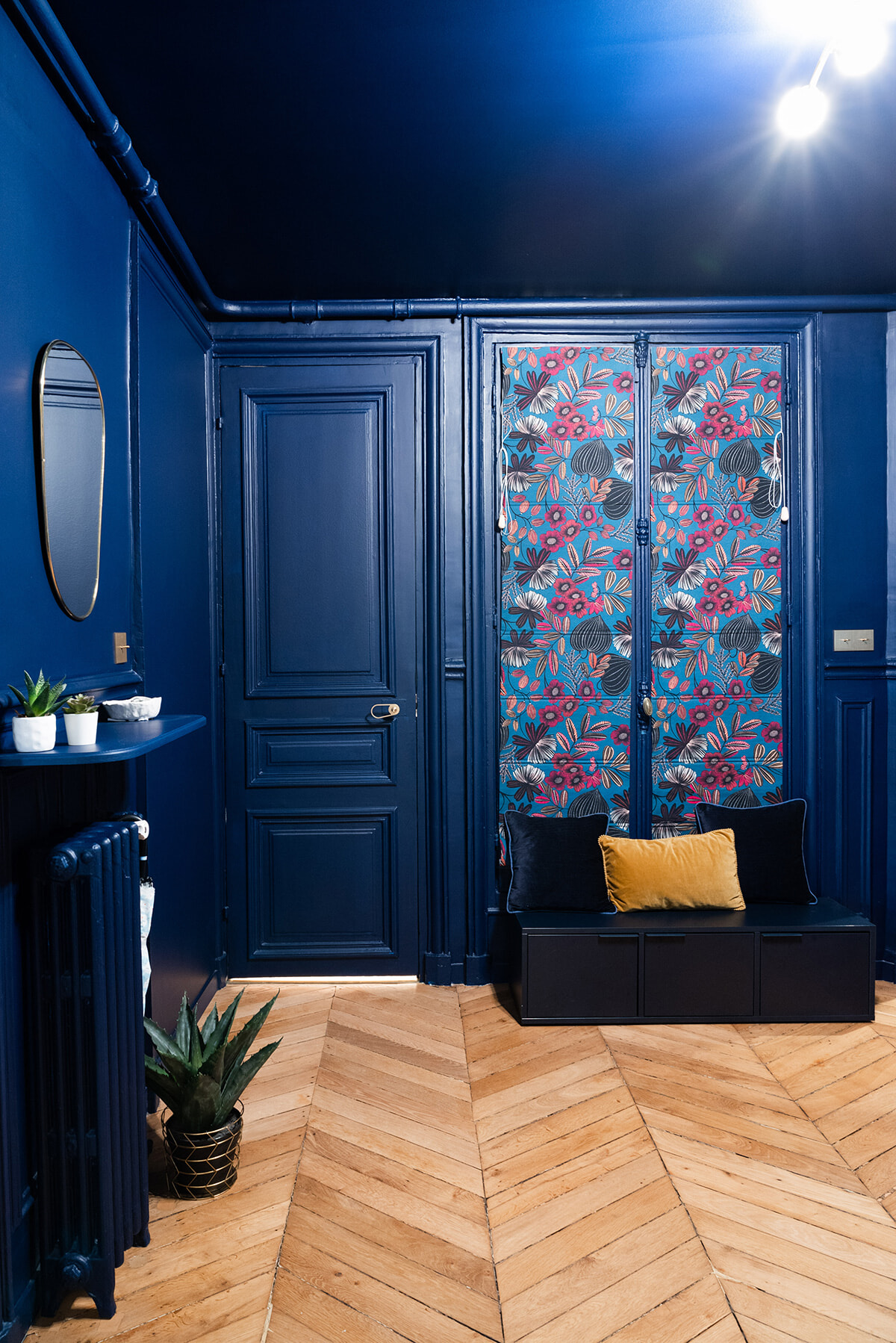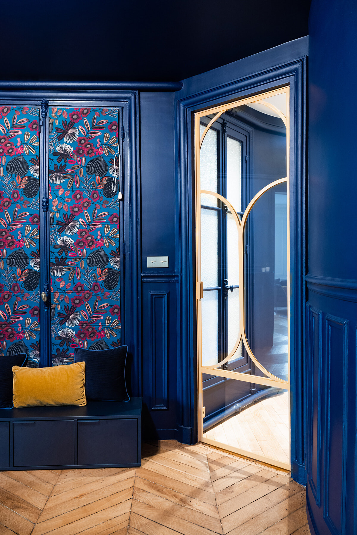 「この玄関は、典型的な星形のオスマン様式の間取りになっており、すべての部屋へとつながっています。私たちはこの構造をそのまま残しました。モールディングはそれほど上質なものではなかったので、配管や電気系統などの設備を隠すための偽天井を設置して天井を少し下げても、特に残念に思うことはありませんでした。この偽天井によって高さは10cmほど低くなりましたが、その代わりに敷居のような効果を生み出すため、つまりアパルトマン全体の入口としてちょっと特別な箱のような空間にするために、床と天井をブルーに塗装しました。」