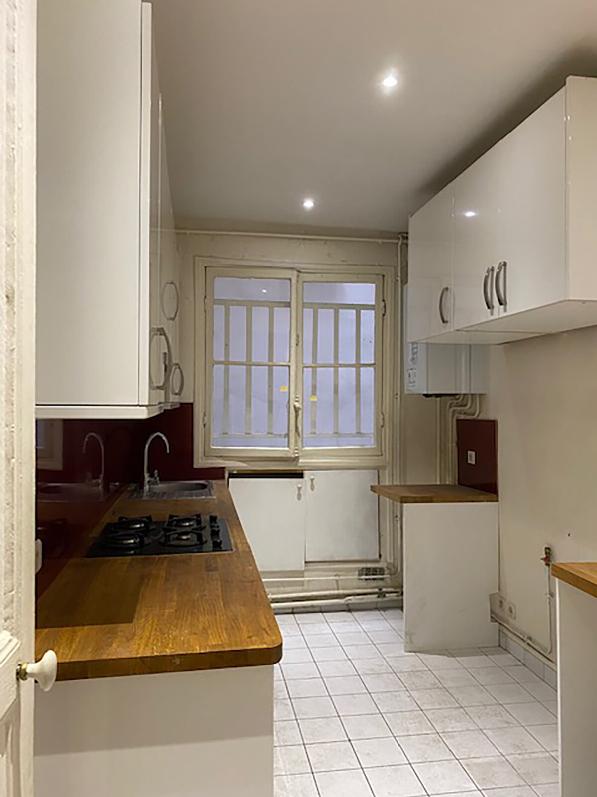 「17区にあるこのアパルトマンは、134㎡の広さの美しいオスマン様式の空間で、長年にわたって同じ家族が住んでいました。そのため、一度も再構築されたことがなく、良い点もあれば不便な点もありました。暖炉やモールディング(装飾的な壁や天井の縁飾り)は保存されていて、それは大きな魅力でした。一方で、現代のライフスタイルに合わせて設計し直されておらず、部屋の配置もいまの生活とはかけ離れたものでした。たとえば、廊下の突き当たりにあるごく小さなキッチンは、昔の使用人部屋に隣接していて、3つの続き間のリビングが並ぶといった具合です。入居するのは夫婦と2人の子どもからなる家族で、もっと流動的で一貫性のある空間を必要としていました。私たちの当初の計画では、キッチンをリビングのひとつに移す予定でしたが、共同住宅の規約上それは認められませんでした。建物全体に関わる技術的な理由で、この案を管理組合に提出しなければならなかったのです。そのため、私たちはこの”離れた場所にあるキッチン”を受け入れて設計するしかなく、結果としてそれが私たちの創造力をさらに刺激するチャレンジとなったのです!」