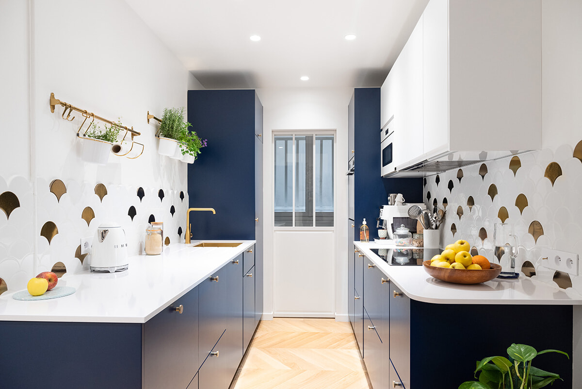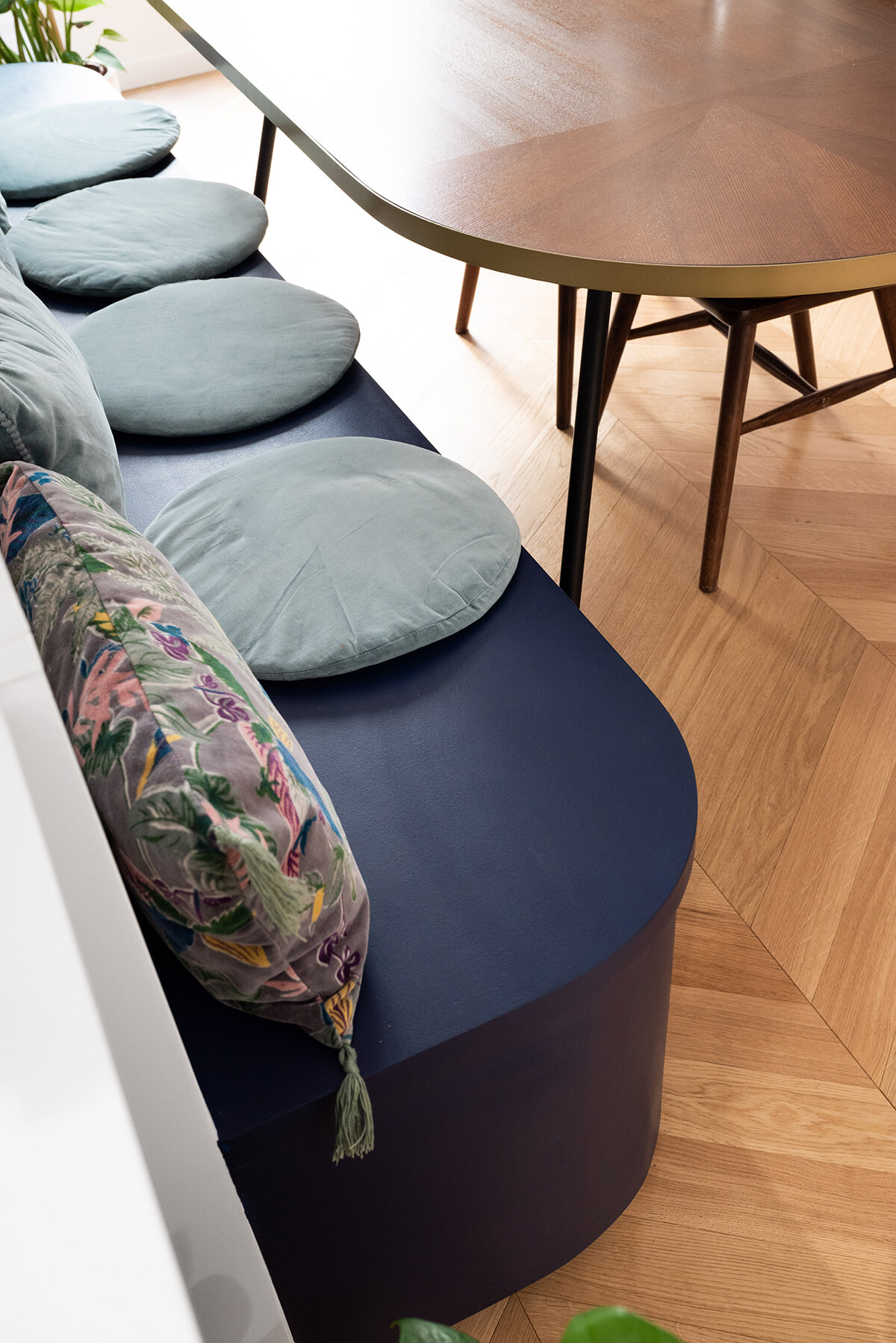 「デザイン面では、特に色選びに関して何度もやりとりを重ねました。最終的に、玄関と同じ深いブルーを採用し、オーダーメイドのベンチシートやキッチンキャビネットをその色で統一しました。家具自体はIKEAのベースユニットにPlum社の扉を取り付けたものです(玄関のブルーも、Plum社の扉と同じ色をRessourceで見つけました)。また、床にはヘリンボーン柄の寄せ木フローリングを敷き、空間全体の調和を図っています。さらに、ひときわ装飾的なアクセントとして、壁の一面に大きな柄の壁紙を採用しました。 真鍮製の水栓金具が華やかさを添え、そのゴールドのトーンは取っ手や食器棚、巾木にもさりげなく反映されています。こうして生まれたキッチンは、機能的でありながらとても美しい空間となり、玄関からガラス扉越しに見える景色が家全体の印象を決定づけています。」