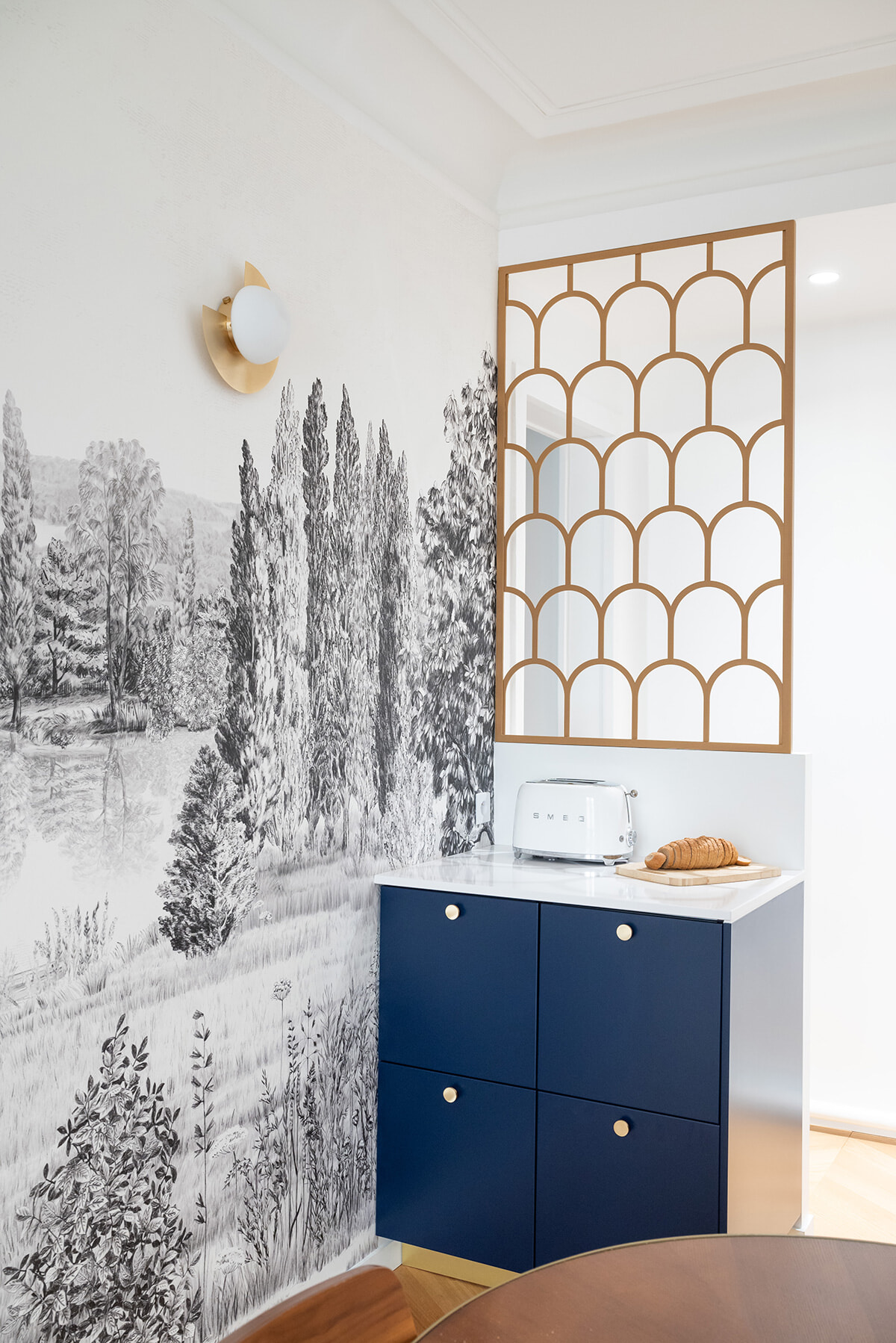 パノラミックな壁紙や真鍮色のうろこ模様など、あらゆるディテールにこだわったキッチン。photography: Agence Smilzz