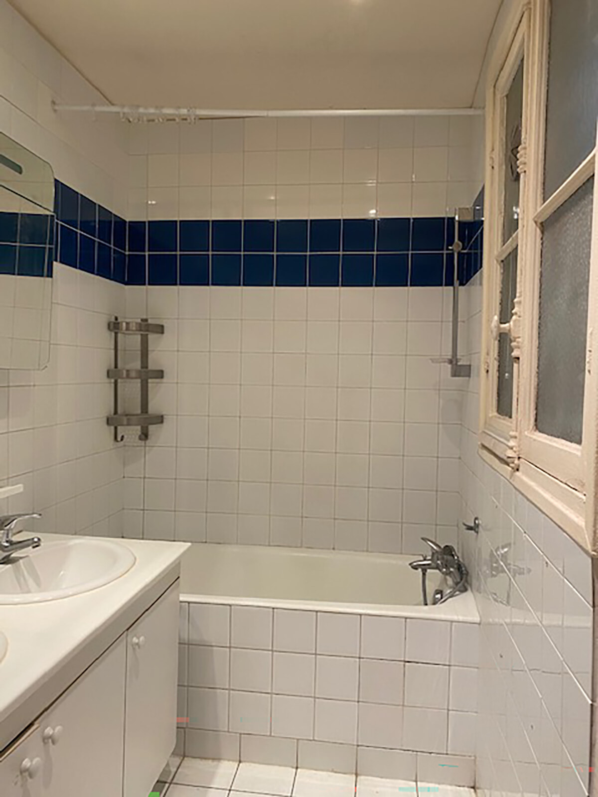 「このバスルームは玄関から直接アクセスできる位置にあります。花柄のロールスクリーンの左側にあるドアがその入口です。もともとこの部屋には浴槽と洗面台があり、それらは同じ位置のまま残しました。ただし、本格的なファミリーバスルームにするために空間の再構築が必要でした。これが少し複雑な作業でした。隣接する子ども部屋の1㎡を取り込むことにし、その部屋には玄関側とリビング側に2つのドアがあったのですが、玄関側を塞いでリビング側だけを残しました。 これによって、新たにシャワーを設置するスペースを確保できました。」
