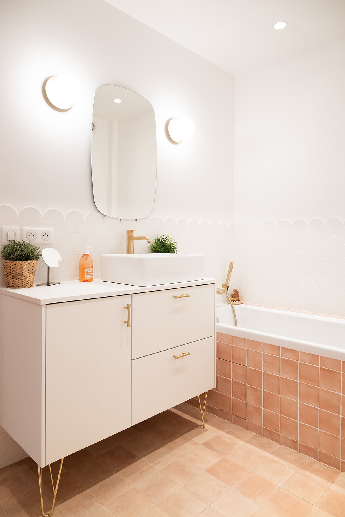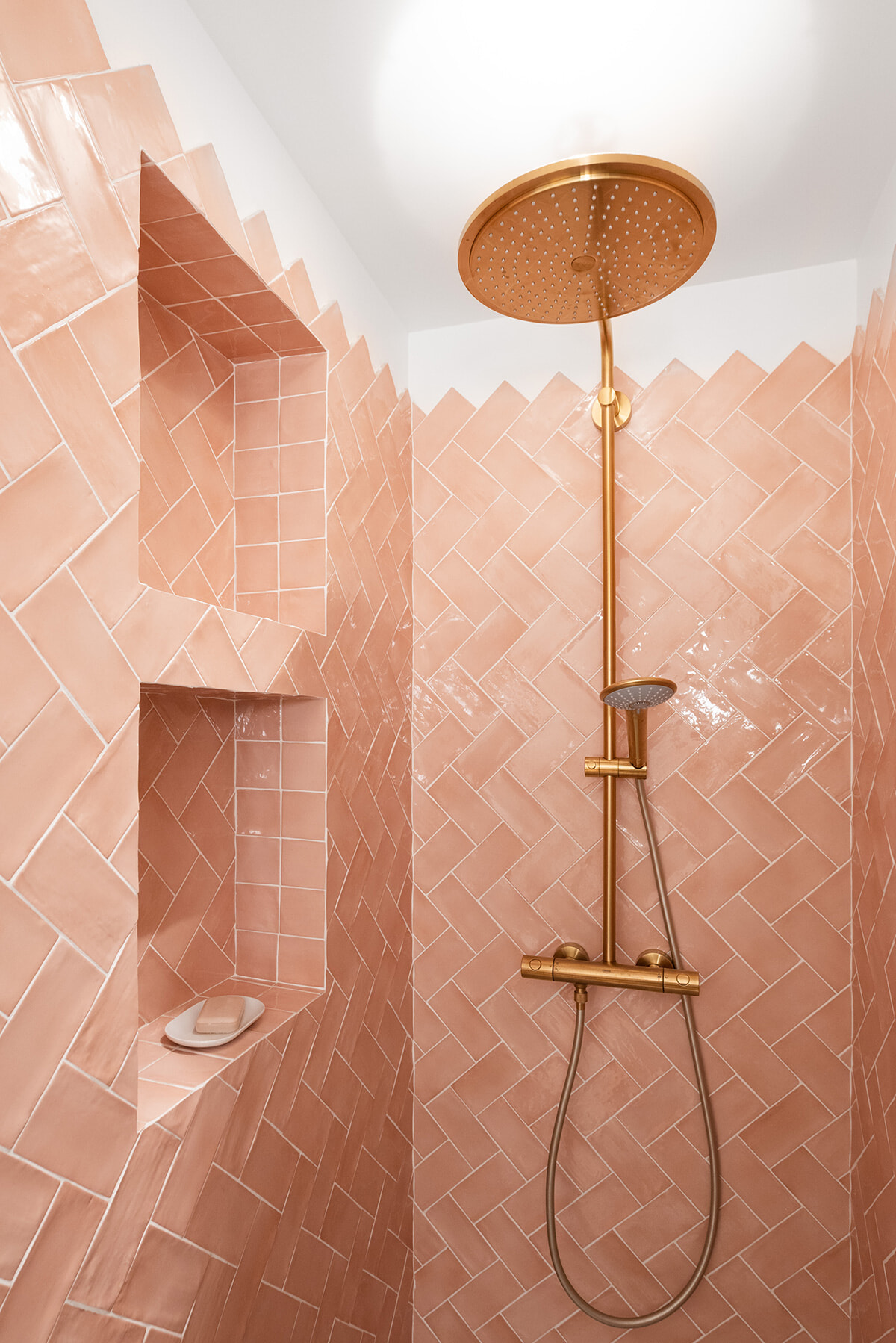 ピンクのタイルで仕上げた、浴槽とシャワーを備えたバスルーム。photography: Agence Smilzz