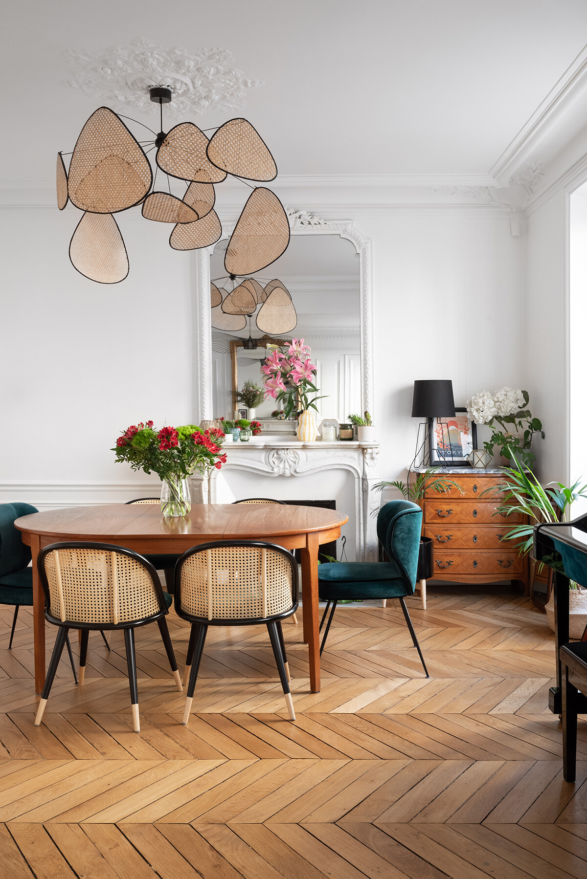 パリのローム通りのこのアパルトマンの青い扉を開けると、134㎡の空間が広がり、古いモールディングや暖炉が新しい色彩と調和している。photography: Agence Smilzz