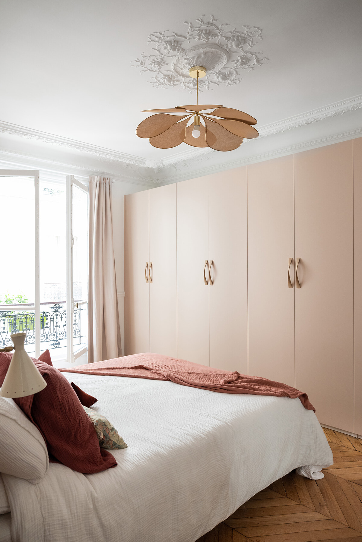 モールディングを隠さない高さに設計された大きなドレッシング収納を備えた寝室。photography: l’agence Smilzz